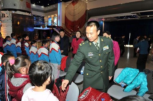 來到北京航天城 在航天城會展中心展廳,孩子們第一次見到了從前只能在電視里見到的英雄航天員費俊龍。當費將軍走進展廳時,孩子們歡呼雀躍,激動的心情寫在紅撲撲的小臉上。孩子們為英雄航天員敬獻紅領巾和莊嚴的少先隊隊禮,以表達他們對航天員叔叔崇高的敬意和無限的敬仰之情。費將軍與孩子們親切握手,鼓勵孩子們要熱愛黨、熱愛人民、熱愛偉大的祖國,要勇敢、堅強,不怕困難,超越自我,珍惜現在的學習條件和所有人的關心幫助,努力學習,真正成為中國特色社會主義事業的合格建設者和接班人!他在講話中表示,通過這次活動能夠為孩子們獻上自己的愛心,積極履行社會責任,非常有意義。費將軍還和國資委直屬機關黨委常務副書記曾堅、企業改革局局長白英姿、直屬機關工會主席呂秋菊以及中國航天科技集團公司五院黨委書記李開民一起,把嶄新的學習用品送到孩子們手中。