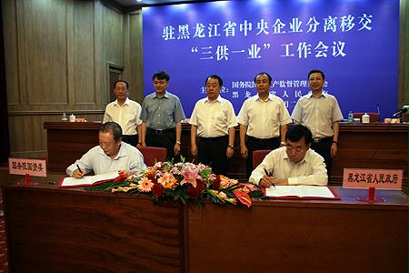 為推進中央企業分離辦社會職能,做好駐黑央企分離移交“三供一業”(供水、供電、供熱和物業管理)工作,6月28日上午,國務院國資委與黑龍江省人民政府在哈爾濱共同召開駐黑龍江省中央企業分離移交“三供一業”工作會議。國務院國資委副主任、黨委副書記邵寧和黑龍江省人民政府副省長張建星出席會議并講話。黑龍江省政協黨組副書記、省國資委黨委書記趙克非和國務院國資委副秘書長郭建新出席了會議。會議由黑龍江省人民政府省長助理、省國資委主任趙杰主持。會上,哈爾濱市政府介紹了分離移交“三供一業”有關政策及經驗;哈電集團、中航工業東安公司、兵器工業集團、國家電網代表有關中央企業作了發言;國務院國資委與黑龍江省人民政府簽署了《關于駐黑龍江省中央企業分離移交“三供一業”工作協議》,有關企業與接收單位簽訂了《分離移交協議》。