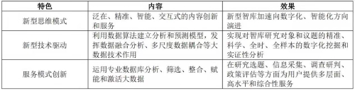 2020年,我國(guó)發(fā)布了《關(guān)于支持新業(yè)態(tài)新模式健康發(fā)展、激活消費(fèi)市場(chǎng)帶動(dòng)擴(kuò)大就業(yè)的意見(jiàn)》《關(guān)于推進(jìn)“上云用數(shù)賦智”行動(dòng)培育新經(jīng)濟(jì)發(fā)展實(shí)施方案》等文件,部署了新消費(fèi)經(jīng)濟(jì)領(lǐng)域的重點(diǎn)任務(wù)。 為了適應(yīng)數(shù)字時(shí)代的迅速發(fā)展,智庫(kù)也在積極進(jìn)行數(shù)字化轉(zhuǎn)型。相對(duì)傳統(tǒng)智庫(kù)而言,數(shù)字智庫(kù)在思維模式創(chuàng)新、新型技術(shù)驅(qū)動(dòng)、服務(wù)模式創(chuàng)新方面具有優(yōu)勢(shì)與特色,見(jiàn)表1。 表1 數(shù)字智庫(kù)的優(yōu)勢(shì)與特色