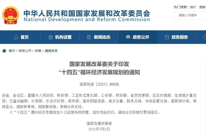 保障資源安全 助力雙碳目標(biāo) ——《“十四五”循環(huán)經(jīng)濟(jì)發(fā)展規(guī)劃》解讀 近日,經(jīng)國(guó)務(wù)院同意,國(guó)家發(fā)展改革委印發(fā)了《“十四五”循環(huán)經(jīng)濟(jì)發(fā)展規(guī)劃》(發(fā)改環(huán)資﹝2021﹞969號(hào),以下簡(jiǎn)稱《規(guī)劃》),全面部署了今后一段時(shí)期我國(guó)循環(huán)經(jīng)濟(jì)發(fā)展的總體思路、主要任務(wù)、重點(diǎn)工程行動(dòng)和保障措施,指明了“十四五”循環(huán)經(jīng)濟(jì)發(fā)展路徑,對(duì)于推進(jìn)循環(huán)經(jīng)濟(jì)發(fā)展,構(gòu)建綠色低碳循環(huán)的經(jīng)濟(jì)體系,助力實(shí)現(xiàn)碳達(dá)峰、碳中和目標(biāo)意義重大。