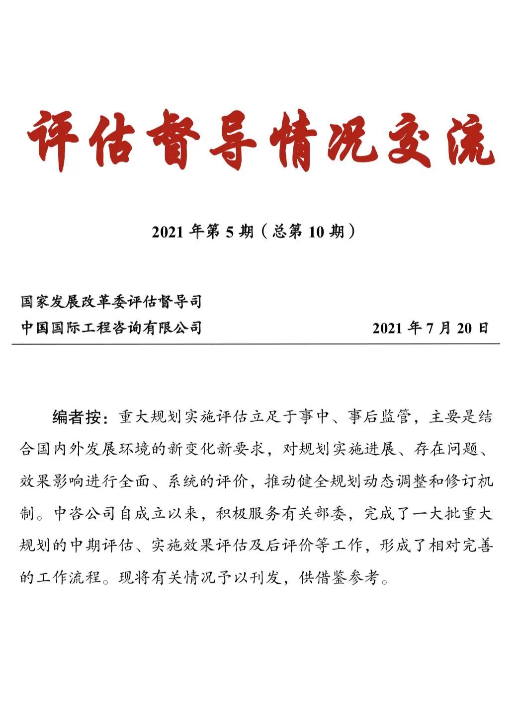 編者按:重大規劃實施評估立足于事中、事后監管,主要是結合國內外發展環境的新變化新要求,對規劃實施進展、存在問題、效果影響進行全面、系統的評價,推動健全規劃動態調整和修訂機制。中咨公司自成立以來,積極服務有關部委,完成了一大批重大規劃的中期評估、實施效果評估及后評價等工作,形成了相對完善的工作流程。現將有關情況予以刊發,供借鑒參考。