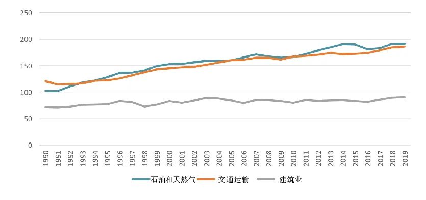 圖2 加拿大主要三個行業溫室氣體排放量數據(1990年--2019年)