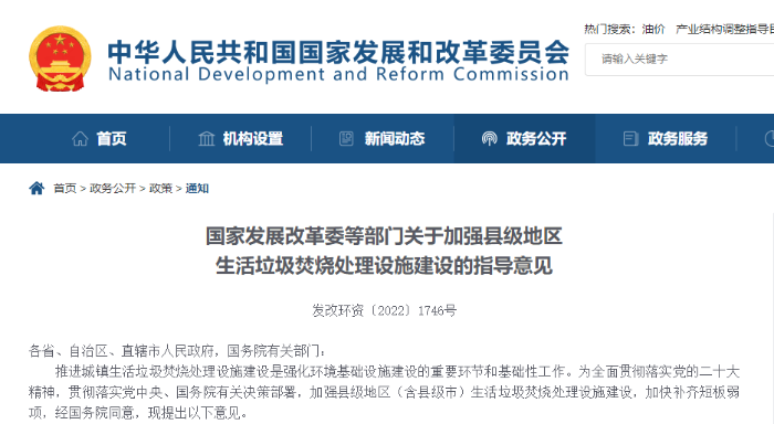 推進城鎮生活垃圾焚燒處理設施建設是強化環境基礎設施建設的重要環節和基礎性工作,是改善人居環境的重要內容。黨中央、國務院高度重視城鎮環境基礎設施,黨的二十大報告明確提出要“提升環境基礎設施建設水平”。近日,經國務院同意,國家發展改革委、住房和城鄉建設部、生態環境部、財政部、人民銀行等部門聯合印發《關于加強縣級地區生活垃圾焚燒處理設施建設的指導意見》(發改環資〔2022〕1746號,以下簡稱《指導意見》),全面系統提出加強縣級地區生活垃圾焚燒處理設施建設的指導思想、工作原則、主要目標、重點任務,指導各地有力有序推進焚燒處理設施建設。《指導意見》作為首個聚焦縣級地區生活垃圾處理的政策文件,是貫徹落實黨的二十大精神的重要舉措,對加快補齊縣級地區生活垃圾焚燒處理短板、提升生活垃圾治理水平、改善人居環境具有重要意義。