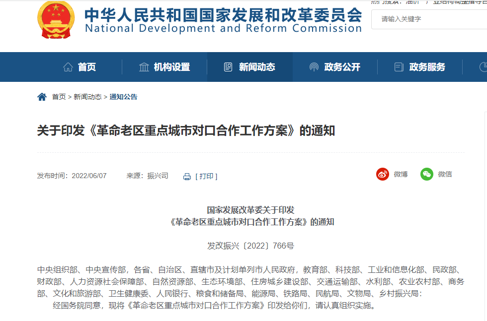 習近平總書記指出,要認真做好東西部扶貧協(xié)作和對口支援、對口合作工作,助力對口地區(qū)跨越發(fā)展。《國務院關于新時代支持革命老區(qū)振興發(fā)展的意見》(國發(fā)〔2021〕3號)明確提出,“研究建立發(fā)達省市與革命老區(qū)重點城市對口合作機制”。《“十四五”特殊類型地區(qū)振興發(fā)展規(guī)劃》進一步指出,要“持續(xù)推動對口支援、對口幫扶、對口協(xié)作、對口合作等工作,強化智力扶持,加強重點領域合作,激發(fā)地區(qū)發(fā)展內(nèi)生動力”。近日,經(jīng)國務院同意,國家發(fā)展改革委印發(fā)了《革命老區(qū)重點城市對口合作工作方案》(以下簡稱《工作方案》)。這是深入貫徹落實《國務院關于新時代支持革命老區(qū)振興發(fā)展的意見》和《“十四五”特殊類型地區(qū)振興發(fā)展規(guī)劃》的具體行動,也是新發(fā)展階段促進區(qū)域協(xié)調(diào)發(fā)展、支持革命老區(qū)振興發(fā)展的創(chuàng)新舉措,將有利于結(jié)對城市優(yōu)勢互補、互學互鑒、互惠互利、共謀發(fā)展,有利于加強區(qū)域協(xié)作合作,共同穩(wěn)定經(jīng)濟增長。 一、《工作方案》是新發(fā)展階段支持革命老區(qū)振興發(fā)展的創(chuàng)新舉措 黨的十八大以來,中央部委、對口支援省市、中央企業(yè)、科研機構(gòu)、社會各界等齊心協(xié)力支持革命老區(qū)振興發(fā)展,先后出臺了百余個支援革命老區(qū)建設的政策文件,幫助革命老區(qū)人民脫貧奔小康,充分發(fā)揮社會主義制度優(yōu)勢和延續(xù)我黨集中力量辦大事的優(yōu)良傳統(tǒng),推動革命老區(qū)與全國同步全面建成小康社會,邁上了全面建設社會主義現(xiàn)代化的新征程。在此背景下,編制和實施《工作方案》,有利于貫徹新發(fā)展理念,發(fā)揮中國特色社會主義制度優(yōu)勢推動共同富裕,構(gòu)建發(fā)達地區(qū)和特殊類型地區(qū)協(xié)同發(fā)展的新局面;有利于發(fā)揮偉大建黨精神的引領作用,激勵革命老區(qū)重點城市和發(fā)達地區(qū)部分城市共同開啟社會主義現(xiàn)代化建設新征程;有利于統(tǒng)籌區(qū)域協(xié)調(diào)發(fā)展,鞏固革命老區(qū)脫貧攻堅成果銜接推進鄉(xiāng)村振興和新型城鎮(zhèn)化,促進革命老區(qū)重點城市和發(fā)達地區(qū)共謀經(jīng)濟社會發(fā)展,同步構(gòu)建高質(zhì)量發(fā)展新格局。 《工作方案》根據(jù)國務院批復的《“十四五”特殊類型地區(qū)振興發(fā)展規(guī)劃》,明確了重點推動贛州、吉安、龍巖、三明、梅州、延安、慶陽、六安、信陽、黃岡、百色、巴中、郴州、張家界、恩施、遵義、長治、汕尾、麗水等20個城市開展對口合作,基于現(xiàn)有東西部協(xié)作、對口合作關系等,選擇位于粵港澳大灣區(qū)、長三角、京津冀的發(fā)達城市與革命老區(qū)重點城市對口合作。《工作方案》同時明確,支持其他革命老區(qū)市縣主動對接東部、中部地區(qū)城市,比照本方案建立對口合作關系。鼓勵相關省(區(qū)、市)結(jié)合實際建立省域內(nèi)結(jié)對幫扶革命老區(qū)市縣工作機制。 二、立足革命老區(qū)振興發(fā)展定位謀劃五大對口合作重點任務 《工作方案》以習近平新時代中國特色社會主義思想為指導,緊密圍繞《國務院關于新時代支持革命老區(qū)振興發(fā)展的意見》以及《“十四五”特殊類型地區(qū)振興發(fā)展規(guī)劃》中關于革命老區(qū)振興發(fā)展的重點任務,準確把握革命老區(qū)振興發(fā)展共性,明確了優(yōu)勢互補、互惠互利、共謀發(fā)展的對口合作工作思路,聚焦促進區(qū)域協(xié)調(diào)發(fā)展、推動區(qū)域合作協(xié)作提出了5大重點任務,進一步豐富了新發(fā)展階段革命老區(qū)振興發(fā)展的實踐路徑。 在促進紅色文化傳承方面,革命老區(qū)是革命傳統(tǒng)的重要承載地,黨史事件多、紅色資源多、革命先輩多,蘊含著中華民族偉大復興的強大精神力量,鑄就了井岡山精神、蘇區(qū)精神、老區(qū)精神等偉大精神,開展黨史學習教育具有獨特優(yōu)勢。《工作方案》明確,結(jié)合對口合作,積極支持赴革命老區(qū)重點城市開展學習交流,大力弘揚偉大建黨精神,傳承弘揚井岡山精神、蘇區(qū)精神、長征精神、遵義會議精神等偉大精神,鼓勵共同開展革命文物保護利用,共同搭建紅色文化旅游融合發(fā)展平臺。 在銜接推進鄉(xiāng)村振興和新型城鎮(zhèn)化方面,12個革命老區(qū)總?cè)丝诩s2.6億,約占全國的19%。《工作方案》明確,結(jié)合對口合作,做好易地扶貧搬遷后續(xù)扶持,加大就業(yè)和產(chǎn)業(yè)扶持力度,推進鄉(xiāng)村振興。持續(xù)加強消費幫扶,推進革命老區(qū)特色農(nóng)產(chǎn)品產(chǎn)銷對接。支持革命老區(qū)重點城市推進以人為核心的新型城鎮(zhèn)化,因地制宜建設區(qū)域性節(jié)點城市、重要交通樞紐、現(xiàn)代產(chǎn)業(yè)基地、商貿(mào)物流中心等。 在完善基礎設施和基本公共服務設施方面,革命老區(qū)大多位于京津冀、長三角、粵港澳大灣區(qū)、成渝都市圈、長江中游城市群的交通物流通道上,提升與城市群、中心城市的互聯(lián)互通水平,補齊公共服務短板,將有力助推革命老區(qū)加快融入?yún)^(qū)域重大戰(zhàn)略,融入構(gòu)建新發(fā)展格局