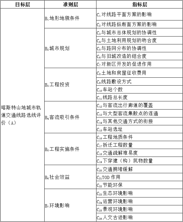 喀斯特山地城市軌道交通線路選線評價指標體系,與平原城市、山地城市的軌道交通線路選線評價指標體系有共性的指標,但也需結合喀斯特山地城市的特點,找出喀斯特山地城市的個性指標,比如地形地貌、地質條件等因素。