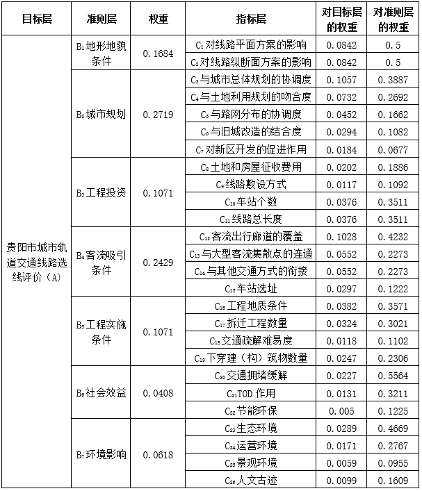 表4 貴陽市城市軌道交通線路選線評價指標體系權重列表