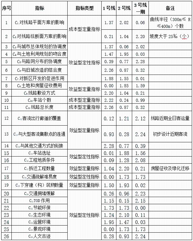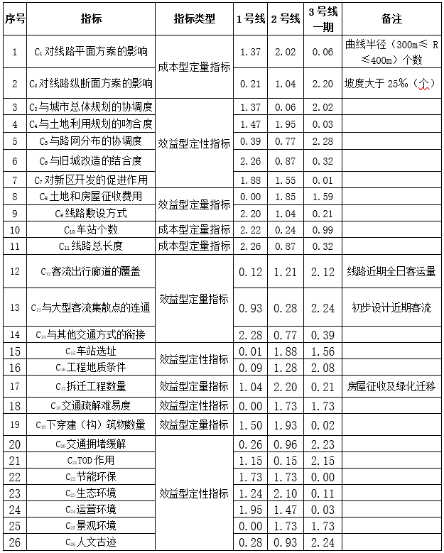 在城市規劃方面,1號線、2號線、3號線一期都非常契合貴陽市的城市發展方向,與城市總體規劃相符合,同時帶動沿線土地集約開發,與土地利用發展相協調,各條線路差距較小。在客流吸引方面,3號線一期工程是貴陽市南北向主要的骨干線,串聯貴陽市主要區域有花溪區、經開區、云巖區、南明區、烏當區。覆蓋了城市的主要客流廊道,且線路近期全日客運量為3條線路中最大的,其次為2號線,1號線客流為3條線路中最小的。在地形地貌方面,2號線最小曲線半徑(300≤ R≤400)最少,1號線次之,3號線一期最多。同時,對于大于25‰的坡度,3號線一期最少,2號線次之,1號線最多。另外,1號線和2號線都從觀山湖區到老城區,線路落差大,存在長大坡道,3號線一期線路無長大坡道。在地形地貌方面,2號線最優,3號線次之,最后為1號線。最后結合各指標權重進行綜合分析得出,3號線一期線路方案最優,2號線線路方案次之,最后為1號線線路方案。