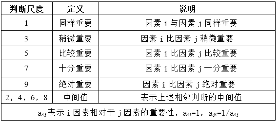 目前的評分方法有很多種,本次研究常用的1-9標度法,即將相互重要程度用數值表示出來,寫成判斷矩陣。其中9級標度判斷矩陣及其含義見表2所示。