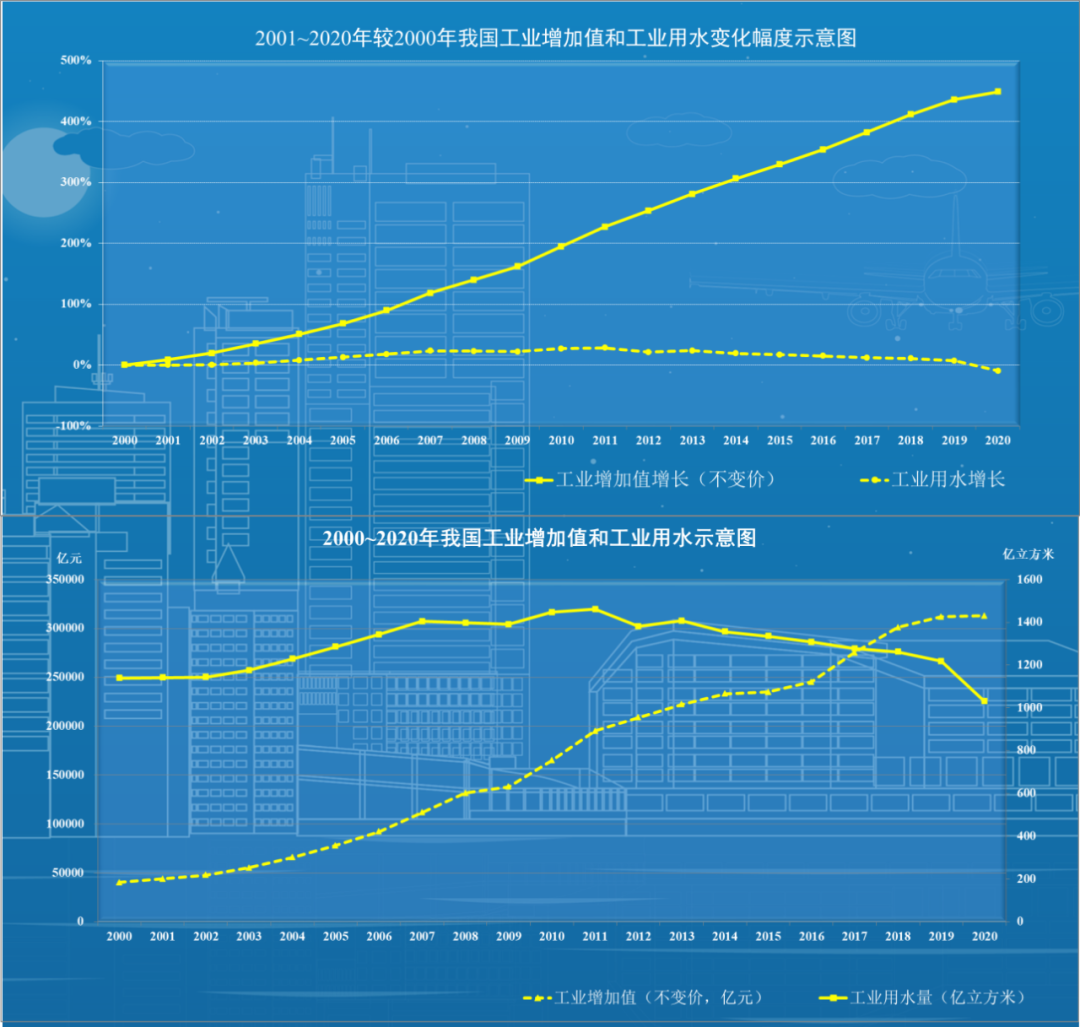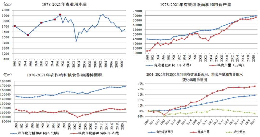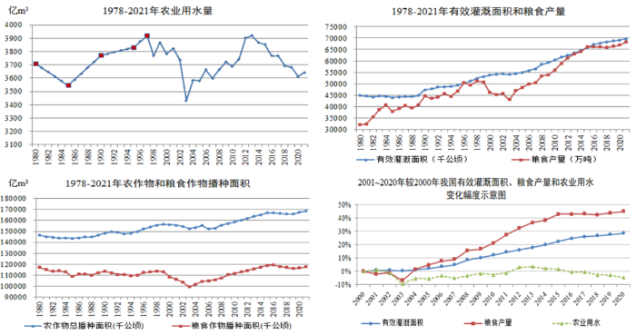 我國用水量轉型特點及水網建設建議 邢智慧 姜富華 曲永會 水是生存之本、文明之源、生態之基。新中國成立以來,我國開展了大規模水利基礎設施建設,水安全保障能力顯著提升,為我國經濟社會高質量發展奠定了堅實的基礎。水資源對經濟社會發展提供重要基礎支撐的同時,也對其形成一定制約,進而促進了技術進步和集約節約利用,最終對用水產生較大影響。長期以來,我國按照以需定供的原則開展供水工程規劃設計,需水預測是核心環節,不同時期經濟社會發展與用水的關系有規可循,并對工程規模確定有著至關重要的作用。因此,研判好經濟社會用水趨勢,對科學合理配置水資源和建設國家水網工程具有重要意義。本文通過分析新中國成立以來用水與經濟社會發展之間的關系,探索內在發展變化規律,為完善水安全保障工程體系提供參考。 一、不同時期用水總體變化趨勢 新中國成立70多年來,經濟和人民生活水平發生了翻天覆地的變化。2021年全國GDP達到114萬億元[1],按不變價計算,比新中國成立之初的1952年增長了200多倍,創造了從一窮二白到經濟總量穩居世界第二位的發展奇跡。相應地,我國用水總量也從1000億m3左右[2]增加至5920億m3左右[3],增加了近5倍。 從用水態勢變化看,1949~1980年(新中國成立~改革開放之初)我國年均用水總量增幅約4.74%,生活、工業和農業用水量均大幅增加,但驅動用水增加主要來自農業。農業用水量由不足1000億m3增加到3700億m3左右,對總用水量增長的貢獻度超過85%,這是新中國成立后我國為解決溫飽問題進行廣泛開荒種糧和大力發展灌溉的結果。 1980~2021年(改革開放以來)我國用水總量增幅明顯回落,年均增幅約0.84%。不同于前一階段,雖然我國糧食產量不斷增加,但農業用水量基本不變或變幅極小,生活、工業、生態用水對總用水量的影響作用較大。 注:本圖中1995年以前的用水量根據1949年、1980年、1985年、1990年和1995年用水總量[2]進行插補;1996年用水量根據1995年和1997年插補;1997~2021年數據來自全國水資源公報。 圖1 新中國成立以來我國用水態勢變化示意圖(單位:億m3) 二、近年用水總量已出現平穩略降的態勢 改革開放之初的1978年,我國總人口96259萬人,GDP約3678.7億元。到2021年,我國總人口已達141260萬人,GDP達到1143669.7億元[1]分別約為1978年的1.46倍和310倍。1980年我國總用水量約4200億m3[2],到2021年增長至5920億m3[3],為1980年的1.4倍。用水增幅低于人口增速,遠低于經濟增速。 分階段看,1980~1997年我國用水總量以年均1.67%的增幅增加,該時期我國處于十一屆三中全會到亞洲金融危機爆發前期的發展階段,人口、城鎮化、經濟總量、糧食產量等保持較高水平的增長。1997~2004年我國用水總量總體基本不變,該時期受亞洲金融危機影響等,除城鎮化率外,人口、經濟總量、糧食產量等增長速度均有所回落。2004~2013年我國用水總量以年均1.21%的增幅增加,用水量恢復較快增長。該階段我國加入了世界貿易組織,經濟增長迅速,超越美國成為全球貨物貿易第一大國,經濟總量超過日本躍升到世界第二位,成為世界第二大經濟體。雖然我國人口、城鎮化發展增長速度減緩,但經濟總量和糧食產量均以改革開放以來最快速度增加。2013~2021年我國用水總量增長率下降為0.54%,該階段處于黨的十八大以來倡導高質量發展的階段。我國全面建成小康社會,實現了第一個百年目標,大力推進生態文明建設,經濟由高速發展階段轉向了高質量發展階段。相應地,我國人口、城鎮化、經濟總量、糧食產量等增長速度均放緩。同時,《國務院關于實行最嚴格水資源管理制度的意見》(國發〔2012〕3號)、《實行最嚴格水資源管理制度考核辦法》(國發〔2013〕2號)等政策相繼出臺,從而全面推進節水型社會建設。 圖2 改革開放以來用水及經濟發展趨勢變化示意圖 綜合上述分析,用水量與人口和經濟發展態勢密切相關,并且隨著我國經濟社會由高速發展邁向高質量發展,在科技進步、節水型社會建設等綜合影響下,工業、農業和生活、生態用水態勢亦隨之發生變化。 (一)工業發展對用水增長拉動作用逐漸減弱 有研究提出[4],改革開放之初,我國工業用水量與工業產值及產業結構之間關系表現為,工業總產值每增長10%,用水量大約增長4%~8%。如果工業結構以鋼鐵、電力等高耗水產業占優勢,用水量增長率接近上限;如果以輕紡、機械等較低耗水產業占優勢,增長率接近下限。 目前,我國已經成為全世界唯一擁有聯合國產業分類中全部工業門類的國家[6]。其中,粗鋼、煤、水泥、化肥產量和發電量等穩居世界第一位,原油產量居世界前列。1978~2012年,我國工業持續保持10%以上的增長速度,對經濟增長的貢獻率超過50%。黨的十八大以來,我國的自主創新能力進一步增強,部分工業的技術水平接近或進入國際先進行列,部分行業技術領先國際先進水平。 隨著工藝技術進步及節水型社會建設不斷推進,工業用水、耗水大幅降低。如上世紀70~80年代,我國每噸工業產品的用水量[7]:造紙200~300m3、煉鋼30~70m3、化學纖維3000~5000m3。進入本世紀10~20年代,以2020年為例,我國高耗水行業每噸產品用水量[8]:造紙7.9~18m3、鋼鐵2.7m3、石油化工10~22m3、紡織100m3。與此同時,工業用水重復率顯著提高。很長一段時間,我國工業水重復利用程度較低,用水工藝比較落后,用水效率較低。如1978年北京城近郊區工業用水的重