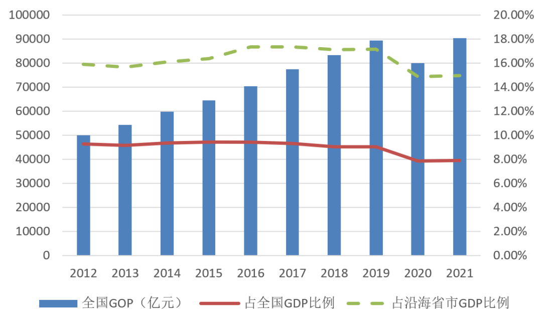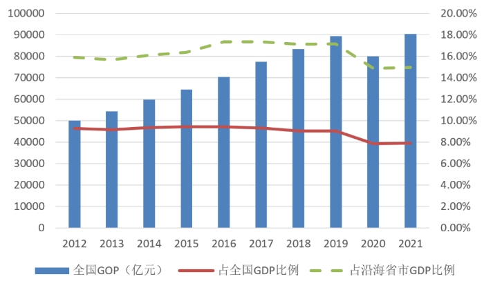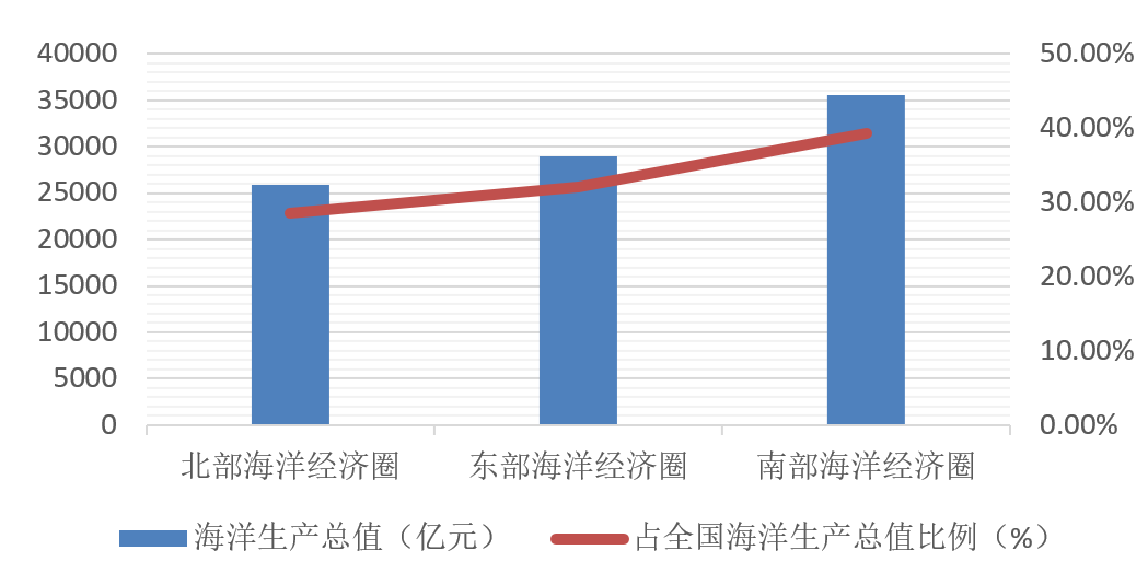 我國海洋經濟高質量發展的對策建議 劉堃 鄒滌 王才君 王海潮 21世紀是海洋的世紀。海洋既是人類賴以生存的藍色家園,也是人類社會可持續發展的資源寶庫和空間載體。海洋經濟是開發、利用和保護海洋的各類產業活動,以及與之相關聯活動的總和。黨的十八大以來,在以習近平同志為核心的黨中央堅強領導下,沿海各省(直轄市、自治區)持續推進海洋經濟發展,海洋產業結構調整步伐加快,自主創新能力不斷提升,供給保障能力持續增強,國際競爭優勢進一步鞏固,海洋經濟已成為國民經濟的強勁增長點。《中共中央關于制定國民經濟和社會發展第十四個五年規劃和二〇三五年遠景目標的建議》中指出,堅持陸海統籌,發展海洋經濟,建設海洋強國。“十四五”規劃建議中,福建、廣東、浙江、山東、海南、遼寧等沿海省份明確提出“建設海洋強省”。 一、我國海洋經濟發展現狀 (一)總體情況 我國是海洋大國,主張管轄海域面積約300萬平方千米,大陸海岸線長1.8萬多千米,島嶼岸線長1.4萬千米,面積大于500平方米的島嶼7300多個,海島陸域總面積約8萬平方千米。遼闊的海域蘊藏著豐富的海洋資源,2萬多種海洋生物,油氣資源沉積盆地約70萬平方千米,近海潮汐能蘊藏量19286萬千瓦,重要海砂資源區面積約30.3萬平方千米。 近年來,我國海洋經濟發展迅速,海洋經濟總體實力進一步提升,海洋經濟布局進一步優化,海洋經濟結構加快調整。2021年,我國海洋生產總值(GOP)首次突破9萬億元,達90385億元,比2020年增長8.3%,高于國民經濟增速0.2個百分點。海洋一、二、三次產業增加值占海洋生產總值的比重為5.0:33.4:61.6(2012年,海洋三次產業增加值占海洋生產總值的比重為5.3:45.9:48.8)。 數據來源:自然資源部,中國海洋經濟統計公報,2021年。 圖1 2021年我國海洋生產總值(GOP)構成 海洋經濟作為高度外向型的經濟類型,受國內國際形勢影響大。近年來,國際環境更趨復雜嚴峻,國內疫情多發散發,對海洋產業鏈供應鏈造成較大沖擊,海洋經濟下行壓力明顯加大。2020-2021年,海洋生產總值在全國GDP占比、沿海省市GDP占比與2019年相比有所下降,保持在8%、15%左右。 數據來源:自然資源部,中國海洋經濟統計公報,2012-2021年。 圖2 我國海洋生產總值及其GDP貢獻年度變化 (二)海洋產業發展現狀 我國已成為世界海洋經濟大國,主要海洋產業規模領跑全球,在海洋漁業、港口航運、濱海旅游及船舶海工等產業領域優勢明顯。2021年,主要海洋產業增加值34050億元,比2020年增長10.0%。 數據來源:自然資源部,中國海洋經濟統計公報,2021年。 圖3 2021年我國主要海洋產業增加值構成 海洋傳統產業優化升級加速。現代化海洋牧場綜合試點有序推進,創建國家級海洋牧場示范區153個(截至2022年7月)。海水養殖走向深藍,全潛式深海漁業養殖裝備“深藍1號”成功收獲我國首批深遠海大西洋鮭,積極探索了我國深遠海養殖新模式。“清潔能源+漁業”成為發展新趨勢,“海上風電+海洋牧場”融合創新示范基地項目、亞洲最大漁光互補光伏發電項目相繼開工建設。海洋船舶建造綠色低碳化發展,綠色動力船舶訂單占全年新接訂單的占比達到24.4%。沿海港口建設智慧化推進,已在廈門港、青島港、上海港、深圳港、日照港、天津港等8個港口建設了33個自動化碼頭。 世界上最大的全潛式深海養殖裝備“深藍一號” 海洋新興產業總體保持較快發展。海洋生物醫藥、海洋電力、海水利用等海洋新興產業增勢強勁,增加值分別比2020年增長18.7%、30.5%和16.4%,顯著高于主要海洋產業增速,領跑海洋經濟。產業公共服務能力日趨增強,國家海洋綜合試驗場(威海)正式掛牌,海水淡化與綜合利用示范基地在天津臨港完成一期中試實驗區建設。海洋產業數字化發展取得新進展,我國首個海洋油氣生產裝備智能制造基地在天津建成投產,首個智能深海油氣保障倉儲中心在海南建成投用,海鐵聯運自動化集裝箱碼頭在廣西欽州啟用。 優勢海洋產業國際競爭力增強。海洋交通運輸業和海洋船舶制造業國際競爭優勢凸顯。2021年,我國海洋交通運輸業實現較快增長,增加值比2020年增長10.3%。沿海港口完成貨物吞吐量和集裝箱吞吐量分別為99.7億噸、2.5億標準箱,居世界第一;其中,寧波舟山港以122405萬噸的吞吐量維持世界第一。海洋交通運輸業新登記企業數同比增長47.5%。同時,國際航運市場復蘇疊加船舶批量更替周期,帶動全球新造船市場超預期回升,我國船企抓住機遇承接大量訂單,海船完工量、新承接訂單量、手持訂單量三大指標實現全面增長,分別同比增長11.3%、147.9%和44.3%。海洋高端裝備制造加快發展,新承接LNG(液化天然氣)船規模達我國歷史最高水平。 寧波舟山港 (三)區域海洋經濟發展情況 依據《“十四五”海洋經濟發展規劃》,我國區域海洋經濟包括北部、東部和南部三個海洋經濟圈。 北部海洋經濟圈指由遼東半島、渤海灣和山東半島沿岸地區所組成的經濟區域,主要包括遼寧省、河北省、天津市和山東省的海域與陸域。2021年,北部海洋經濟圈海洋生產總值25867億元,占全國海洋生產總值的比重為28.6%。 東部海洋經濟圈指由長江三角洲的沿岸地區所組成的經濟區域,主要包括江蘇省、上海市和浙江省的海域與陸域。2021年,東部海洋經濟圈海洋生產總值29000億元,占全國海洋生產總值的比重為32.1%。 南部海洋經濟圈指由福建、珠江口及