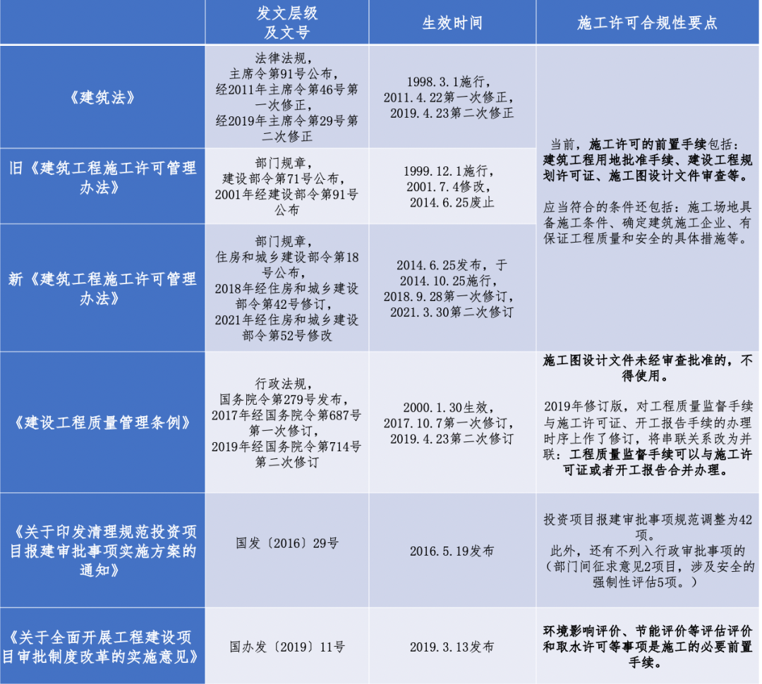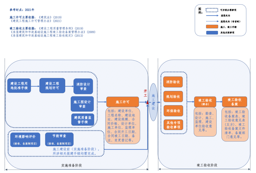 編者按 新中國成立以來,我國基礎設施投資建設取得了舉世矚目的成就,是國家經濟社會發展的重要支撐,為人民生活水平的提高做出了巨大貢獻。改革開放以來,市場開始發揮配置資源的決定性作用,為我國基礎設施的發展煥發了新的活力。據統計,我國基礎設施資產總規模在1990年排在全世界約第15位,2000年上升到第7位,2010年躍升為第3位,至2018年已居世界首位。 黨的二十大報告在回顧過去五年的工作和新時代十年的偉大變革中,充分肯定了基礎設施在經濟社會中發揮的重要作用。報告指出,我國“建成世界最大的高速鐵路網、高速公路網,機場港口、水利、能源、信息等基礎設施建設取得重大成就”。我國基礎設施多年來大規模的投資建設和存量資產的高速積累,是黨中央、國務院在建立社會主義市場經濟體制背景下,關于投融資體制改革部署的重要成果。 項目前期工作手續的合規性要求,是基礎設施能夠發揮其應有價值的重要前提,也是投融資體制改革關注的重點內容之一。伴隨著政府職能轉變、深化“放管服”改革和擴大有效投資等重大決策的關鍵部署,我國工程建設項目審批制度不斷優化和改革,基礎設施項目投資前期決策管理經歷了復雜的演變進程,其合規性標準也在與時俱進、不斷完善。當前我國已進入基礎設施存量時代,存量資產項目前期工作手續的合規性是重要的盤活條件之一,部分合規性問題已成為新時代社會廣泛關注的焦點。本項專題研究立足投融資體制和項目審批制度變革的歷史背景,嘗試厘清基礎設施項目在立項、土地、規劃、環境、建設施工等方面主要前期工作的歷史變革脈絡,梳理不同管理事項之間的邏輯關聯,從這一視角提供基礎設施項目前期工作手續的合規性認識。本公眾號將研究報告的部分成果以系列文章的形式陸續刊發,研究報告第一部分為背景與立項篇,第二部分為土地與規劃篇,本文是系列研究報告的第三部分(建設施工篇),供業界同仁參考。 基礎設施項目前期工作手續合規性研究(Ⅲ) 張雪飛 伍迪 摘要:開工和竣工是基礎設施項目建設施工方面的重要工作節點,依法合規開展有關工作是項目的合規性前提。建筑工程施工許可證(或開工報告)是建筑施工單位符合施工條件、允許開工的批準文件,是建設單位進行工程施工的法律憑證,是工程項目由實施準備轉向施工建設、由藍圖設計變成項目實體的重要工作手續。竣工驗收是建設工程項目竣工后,全面考核建設工作、檢查是否符合設計要求和工程質量的重要環節,是工程項目由施工建設走向運營投產,是建設投資成果轉入交付使用的關鍵工作事項。本文聚焦基礎設施項目建設施工方面的手續,尤其對施工許可和竣工驗收兩方面的主要內容和制度演進進行系統梳理,供業界參考。 關鍵詞:基礎設施;合規性;施工許可;竣工驗收;政策演進 一、施工許可手續合規性 (一)內涵與適用范圍 建筑工程施工許可證是建筑施工單位符合施工條件、允許開工的批準文件,是建設單位進行工程施工的法律憑證。根據有關法律政策規定,在中華人民共和國境內從事各類房屋建筑及其附屬設施的建造、裝修裝飾和與其配套的線路、管道、設備的安裝,以及城鎮市政基礎設施工程的施工,建設單位在開工前應當向工程所在地縣級以上人民政府建設行政主管部門申請領取施工許可證,國務院建設行政主管部門確定的限額以下的小型工程除外。具體而言,對于工程投資額在30萬元以下或者建筑面積在300平方米以下的建筑工程,可以不申請辦理施工許可證。各省、自治區、直轄市人民政府住房城鄉建設主管部門可以根據當地的實際情況,對限額進行調整,并報國務院住房城鄉建設主管部門備案。按照國務院規定的權限和程序批準開工報告的建筑工程,不再領取施工許可證。 辦理施工許可證有關事項應主要以《中華人民共和國建筑法》(以下簡稱《建筑法》)和《建筑工程施工許可管理辦法》等法規政策為依據。根據最新修訂且現行有效的2019年版《建筑法》和2021年版《建筑工程施工許可管理辦法》,申請領取施工許可證,應當符合的條件包括:(1)依法應當辦理用地批準手續的,已經辦理該建筑工程用地批準手續;(2)依法應當辦理建設工程規劃許可證的,已經取得建設工程規劃許可證;(3)施工場地已經基本具備施工條件,需要征收房屋的,其拆遷進度符合施工要求;(4)已經確定建筑施工企業;(5)有滿足施工需要的資金安排、施工圖紙及技術資料,其中施工圖設計文件已按規定審查合格;(6)有保證工程質量和安全的具體措施。 施工許可證的時效方面,根據有關規定,建設單位應當自領取施工許可證之日起3個月內開工。因故不能按期開工的,應當向發證機關申請延期;延期以兩次為限,每次不超過3個月。既不開工又不申請延期或者超過延期時限的,施工許可證自行廢止。在建的建筑工程因故中止施工的,建設單位應當自中止施工之日起1個月內,向發證機關報告,并按照規定做好建筑工程的維護管理工作。建筑工程恢復施工時,應當向發證機關報告;中止施工滿1年的工程恢復施工前,建設單位應當報發證機關核驗施工許可證。按照國務院有關規定批準開工報告的建筑工程,因故不能按期開工或者中止施工的,應當及時向批準機關報告情況。因故不能按期開工超過6個月的,應當重新辦理開工報告的批準手續。 (