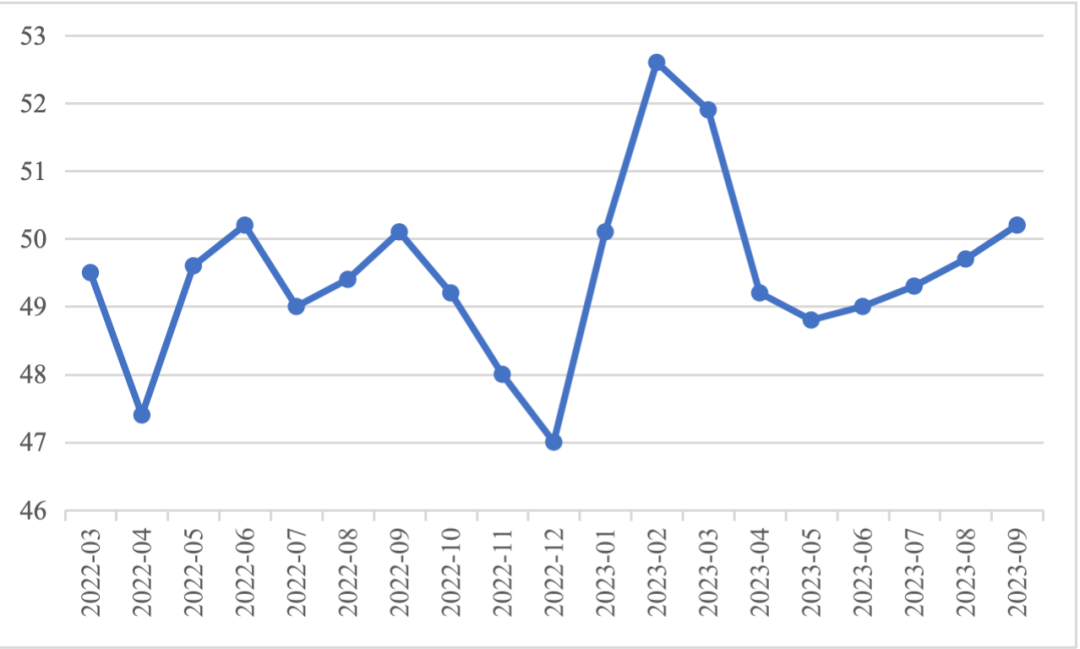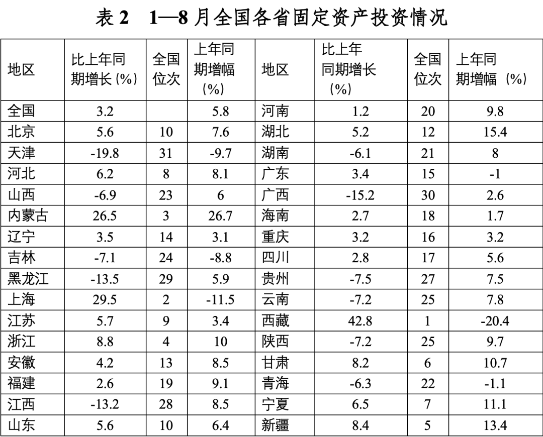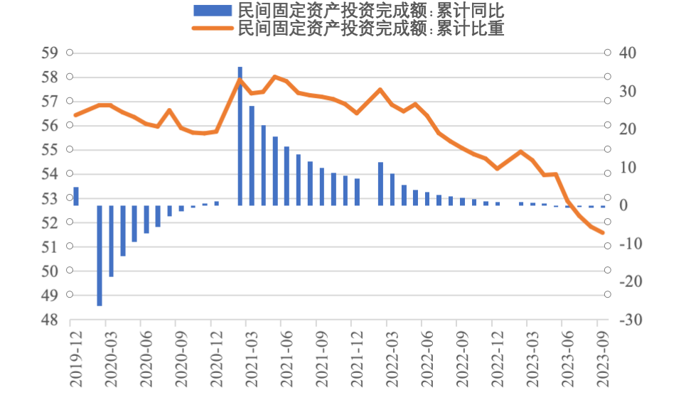 2023年前三季度,我國(guó)經(jīng)濟(jì)運(yùn)行持續(xù)恢復(fù)向好,投資對(duì)優(yōu)化供給結(jié)構(gòu)的關(guān)鍵作用顯著增強(qiáng),高技術(shù)產(chǎn)業(yè)投資保持較快增長(zhǎng),基礎(chǔ)設(shè)施投資、制造業(yè)投資穩(wěn)投資支撐作用進(jìn)一步發(fā)揮。同時(shí),當(dāng)前穩(wěn)投資也面臨新的困難挑戰(zhàn),尤其是房地產(chǎn)市場(chǎng)深度調(diào)整導(dǎo)致房地產(chǎn)開(kāi)發(fā)投資和民間投資承受較大下行壓力。下一步仍需精準(zhǔn)有力加強(qiáng)逆周期調(diào)控,不斷拓展促投資政策空間,重點(diǎn)圍繞提振房地產(chǎn)市場(chǎng)、推動(dòng)制造業(yè)轉(zhuǎn)型升級(jí)、激發(fā)民間投資活力等方面,繼續(xù)夯實(shí)投資復(fù)蘇基礎(chǔ)。 一、固定資產(chǎn)投資整體運(yùn)行情況 (一)整體投資保持平穩(wěn)增長(zhǎng)態(tài)勢(shì) 2023年1—9月,我國(guó)固定資產(chǎn)投資(不含農(nóng)戶,下同)375035億元,同比增長(zhǎng)3.1%,較國(guó)內(nèi)生產(chǎn)總值增速低了2.1個(gè)百分點(diǎn),較上半年增速低了0.7個(gè)百分點(diǎn),固定資產(chǎn)投資增速持續(xù)放緩。從投資構(gòu)成看,上半年建安工程、設(shè)備工器具購(gòu)置、其他費(fèi)用分別增長(zhǎng)2.4%、6.8%、3.1%。設(shè)備工器具購(gòu)置保持較快增長(zhǎng),反映在各類政策工具支持引導(dǎo)下,企業(yè)設(shè)備購(gòu)置、技術(shù)改造投入力度加大。 圖1 全國(guó)固定資產(chǎn)投資增速(%) 數(shù)據(jù)來(lái)源:國(guó)家統(tǒng)計(jì)局 (二)民間投資意愿和能力仍待恢復(fù) 2023年1—9月,民間固定資產(chǎn)投資為193399億元,同比下降0.6%,較上半年低了0.4個(gè)百分點(diǎn),低于投資整體增速3.7個(gè)百分點(diǎn)。從季度波動(dòng)看,民間固定資產(chǎn)投資的增速由2022年第一季度的8.4%持續(xù)下滑,并連續(xù)兩個(gè)季度負(fù)增長(zhǎng)。民間固定資產(chǎn)投資占比進(jìn)一步萎縮,跌至2011年以來(lái)的最低點(diǎn),僅為51.57%。 圖2 民間投資增速及占比(%) 數(shù)據(jù)來(lái)源:國(guó)家統(tǒng)計(jì)局,Wind數(shù)據(jù)庫(kù) 國(guó)家統(tǒng)計(jì)局發(fā)布信息顯示,房地產(chǎn)投資中約80%為民間投資。受房地產(chǎn)市場(chǎng)深度調(diào)整影響,民間投資動(dòng)力和能力相對(duì)不足,國(guó)有及國(guó)有控股單位投資增速連續(xù)20個(gè)月高于民間投資增速。2023年1—9月,國(guó)有及國(guó)有控股單位同比增長(zhǎng)7.2%,較民間投資增速高了7.8個(gè)百分點(diǎn)。 圖3 民間投資、國(guó)有及國(guó)有控股單位投資增速(%) 數(shù)據(jù)來(lái)源:國(guó)家統(tǒng)計(jì)局,Wind數(shù)據(jù)庫(kù) (三)制造業(yè)投資保持較快增長(zhǎng),基礎(chǔ)設(shè)施補(bǔ)短板投入加大 2023年1—9月,制造業(yè)和基建投資保持較快增長(zhǎng),房地產(chǎn)投資持續(xù)負(fù)增長(zhǎng),且降幅有所擴(kuò)大。基礎(chǔ)設(shè)施投資在專項(xiàng)債等融資支持政策以及重大項(xiàng)目支撐下,效果持續(xù)顯現(xiàn),前三季度基礎(chǔ)設(shè)施投資同比增長(zhǎng)8.64%,高于全部投資5.54個(gè)百分點(diǎn),是三大類投資中增長(zhǎng)最快的領(lǐng)域。其中,鐵路運(yùn)輸業(yè)、倉(cāng)儲(chǔ)業(yè)投資分別大幅增長(zhǎng)22.1%、27.7%。截至9月底,新增地方政府專項(xiàng)債已發(fā)行超過(guò)3.1萬(wàn)億元,完成全年專項(xiàng)債額度的80%以上,對(duì)基礎(chǔ)設(shè)施投資形成較強(qiáng)支撐。1—9月份,計(jì)劃總投資億元及以上項(xiàng)目投資同比增長(zhǎng)10.2%,較1—8月快了0.3個(gè)百分點(diǎn),對(duì)全部投資增長(zhǎng)的貢獻(xiàn)率達(dá)169.2%,大項(xiàng)目投資帶動(dòng)作用明顯。 數(shù)據(jù)來(lái)源:國(guó)家統(tǒng)計(jì)局,Wind數(shù)據(jù)庫(kù) 2023年1—9月,制造業(yè)投資同比增長(zhǎng)6.2%,比整體投資高3.1個(gè)百分點(diǎn)。其中,高技術(shù)制造業(yè)投資同比增長(zhǎng)11.3%,對(duì)制造業(yè)投資拉動(dòng)作用明顯,表明我國(guó)制造業(yè)加速轉(zhuǎn)型升級(jí)。9月,制造業(yè)采購(gòu)經(jīng)理指數(shù)(PMI)為50.2%,比上月上升0.5個(gè)百分點(diǎn),重返擴(kuò)張區(qū)間。生產(chǎn)指數(shù)和新訂單指數(shù)均高于臨界點(diǎn),分別為52.7%和50.5%,表明制造業(yè)生產(chǎn)和市場(chǎng)需求穩(wěn)步回升。裝備制造業(yè)、高技術(shù)制造業(yè)PMI分別為50.6%、50.1%,均位于擴(kuò)張區(qū)間。從企業(yè)規(guī)模看,大、中、小型企業(yè)PMI分別為51.6%、49.6%和48%,其中大型企業(yè)PMI較上月回升0.8個(gè)百分點(diǎn),為近6個(gè)月高點(diǎn),表現(xiàn)出強(qiáng)勁恢復(fù)發(fā)展動(dòng)能。 圖4:制造業(yè)PMI指數(shù)(%) 數(shù)據(jù)來(lái)源:國(guó)家統(tǒng)計(jì)局,Wind數(shù)據(jù)庫(kù) 2023年1—9月,房地產(chǎn)開(kāi)發(fā)投資增速持續(xù)放緩,房地產(chǎn)開(kāi)發(fā)投資、住宅開(kāi)發(fā)投資分別同比下降9.1%、8.4%。房地產(chǎn)開(kāi)發(fā)投資占固定資產(chǎn)投資完成額的比重降至23.3%,較上半年下降0.8個(gè)百分點(diǎn),為今年以來(lái)最低值。房屋施工面積、房屋新開(kāi)工面積等先行指標(biāo)均出現(xiàn)明顯下滑,分別同比下降7.1%、23.4%。1—9月,國(guó)房景氣指數(shù)均位于100以下,自4月以來(lái)持續(xù)