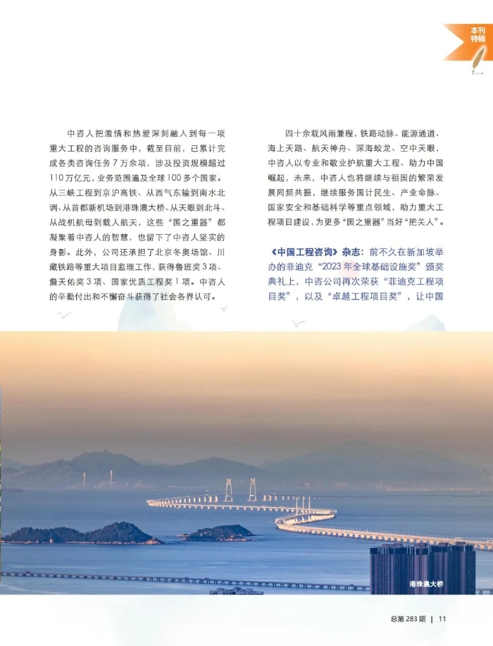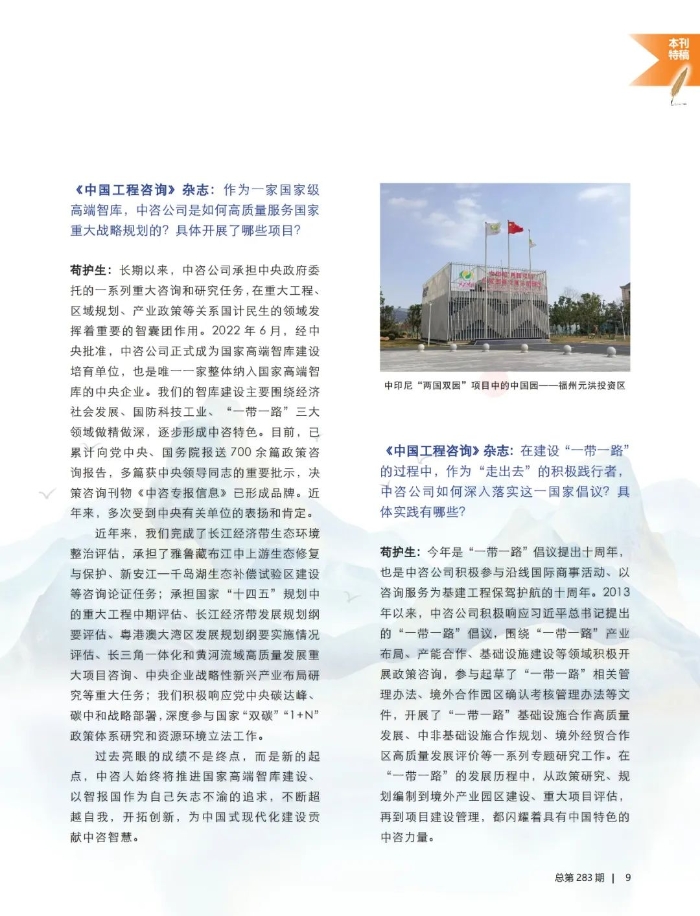 喜訊再度傳來!今年的金秋九月,在新加坡舉辦的菲迪克“2023年全球基礎設施獎”頒獎典禮上,中國國際工程咨詢有限公司(以下簡稱中咨公司)再次榮獲“菲迪克工程項目獎”,并捧得全球大型項目領域唯一的“卓越工程項目獎”。這是對中咨公司在工程咨詢領域杰出貢獻的認可,也證明了中咨公司在全球工程咨詢行業中的領先地位和專業水平。 中咨公司成立于1982年,是國家高端智庫和首屈一指的綜合性工程咨詢機構,也是國家投資建設領域決策科學化、民主化的見證者、先行者、踐行者。自成立以來,中咨公司始終以高質量咨詢成果服務“國之大者”、助建“國之重器”,高質量服務共建“一帶一路”,在國家經濟社會發展中發揮著獨特的參謀助手作用。近日,《中國工程咨詢》雜志專訪了中國國際工程咨詢有限公司黨委書記、董事長、總經理茍護生,分享了中咨公司在服務國家重大戰略、重大規劃、重大項目背后的故事,講述中咨公司“服務國家、貢獻社會”的初心使命。 《中國工程咨詢》雜志:作為一家國家級高端智庫,中咨公司是如何高質量服務國家重大戰略規劃的?具體開展了哪些項目? 茍護生:長期以來,中咨公司承擔中央政府委托的一系列重大咨詢和研究任務,在重大工程、區域規劃、產業政策等關系國計民生的領域發揮著重要的智囊團作用。2022年6月,經中央批準,中咨公司正式成為國家高端智庫建設培育單位,也是唯一一家整體納入國家高端智庫的中央企業。我們的智庫建設主要圍繞經濟社會發展、國防科技工業、“一帶一路”三大領域做精做深,逐步形成中咨特色。目前,已累計向黨中央、國務院報送700余篇政策咨詢報告,多篇獲中央領導同志的重要批示,決策咨詢刊物《中咨專報信息》已形成品牌。近年來,多次受到中央有關單位的表揚和肯定。 近年來,我們完成了長江經濟帶生態環境整治評估,承擔了雅魯藏布江中上游生態修復與保護、新安江—千島湖生態補償試驗區建設等咨詢論證任務;承擔國家“十四五”規劃中的重大工程中期評估、長江經濟帶發展規劃綱要評估、粵港澳大灣區發展規劃綱要實施情況評估、長三角一體化和黃河流域高質量發展重大項目咨詢、中央企業戰略性新興產業布局研究等重大任務;我們積極響應黨中央碳達峰、碳中和戰略部署,深度參與國家“雙碳”“1+N”政策體系研究和資源環境立法工作。 過去亮眼的成績不是終點,而是新的起點,中咨人始終將推進國家高端智庫建設、以智報國作為自己矢志不渝的追求,不斷超越自我,開拓創新,為中國式現代化建設貢獻中咨智慧。 《中國工程咨詢》雜志:在建設“一帶一路”的過程中,作為“走出去”的積極踐行者,中咨公司如何深入落實這一國家倡議?具體實踐有哪些? 茍護生:今年是“一帶一路”倡議提出十周年,也是中咨公司積極參與沿線國際商事活動、以咨詢服務為基建工程保駕護航的十周年。2013年以來,中咨公司積極響應習近平總書記提出的“一帶一路”倡議,圍繞“一帶一路”產業布局、產能合作、基礎設施建設等領域積極開展政策咨詢,參與起草了“一帶一路”相關管理辦法、境外合作園區確認考核管理辦法等文件,開展了“一帶一路”基礎設施合作高質量發展、中非基礎設施合作規劃、境外經貿合作區高質量發展評價等一系列專題研究工作。在“一帶一路”的發展歷程中,從政策研究、規劃編制到境外產業園區建設、重大項目評估,再到項目建設管理,都閃耀著具有中國特色的中咨力量。 中咨公司圍繞新時期高水平對外開放,為高質量推進“一帶一路”建設提供全方位咨詢服務:承擔了埃塞北部鐵路、喀麥隆水廠等項目全過程咨詢;完成了玻利維亞煉廠優惠貸款項目現場考察和綜合評估;承擔的援柬埔寨交通領域總體規劃項目順利完成并移交,得到柬方高度評價;完成了“沙特大陸橋”階段性評估;克服艱難險阻,完成中老鐵路監理任務;中老鐵路搬遷安居村項目獲得中國援外項目“優良”工程評定;中印尼“兩國雙園”項目為兩國貿易打造了“一帶一路”經貿往來的大通道、產業合作的連通器、民心相通的新載體……在共建“一帶一路”的征程上,中咨人的腳步從未停下,從規劃、評估、咨詢、監理到全過程咨詢,每一步都緊跟國家戰略方向。下一個十年里,中咨人將更加奮發作為,為高質量共建人類命運共同體作出新貢獻。 問:如今,在不少重大工程中常常能見到中咨公司的身影,作為歷史發展的見證者,中咨公司如何高質量投身國家重大工程建設? 茍護生:習近平總書記指出,“中國經濟社會快速發展,其中工程科技創新驅動功不可沒”,“三峽工程、西氣東輸、西電東送、南水北調、青藏鐵路、高速鐵路等一大批重大工程建設成功,大幅度提升了中國的基礎工業、制造業、新興產業等領域創新能力和水平,加快了中國現代化進程”。重大工程是落實國家戰略意圖、實現國家發展目標的重要抓手,是保障和促進經濟發展的“壓艙石”,是名副其實的“國之重器”。中咨公司承擔了改革開放以來幾乎所有國家重大工程項目的咨詢評估任務,是歷史的親歷者、更是國家發展的參與者。 多年來,中咨公司完成了南水北調、川藏鐵路、白鶴灘—浙江特高壓輸電、西氣東輸四線引江補漢、三峽水運新通道、藏東南至粵港澳輸電通道、川氣東送二線、載人