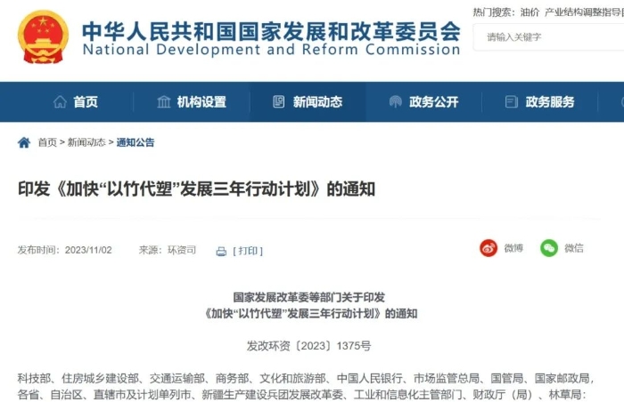 深入踐行“兩山”理念 扎實推進“以竹代塑” 朱黎陽 2022年11月7日,習(xí)近平總書記在致國際竹藤組織成立二十五周年志慶暨第二屆世界竹藤大會賀信上作出“以竹代塑”重要指示,為加強塑料污染全鏈條治理指明了方向。近日,國家發(fā)展改革委等部門印發(fā)了《加快“以竹代塑”發(fā)展三年行動計劃》(發(fā)改環(huán)資〔2023〕1375號,以下簡稱《行動計劃》),系統(tǒng)部署了七大重點行動、三大保障措施,并同步發(fā)布了“以竹代塑”主要產(chǎn)品名錄,推動“以竹代塑”高質(zhì)量發(fā)展,助力減少塑料污染。 一、推進“以竹代塑”意義重大 推進“以竹代塑”是加強塑料污染全鏈條治理的必然要求。從國內(nèi)看,雖然塑料垃圾大規(guī)模泄漏到自然環(huán)境的態(tài)勢得到了有效遏制,但是一次性塑料購物袋、外賣等領(lǐng)域問題仍然存在。從國際看,塑料污染問題受到國際社會廣泛關(guān)注,全球各國都在尋找兼顧環(huán)境治理與經(jīng)濟發(fā)展的塑料污染治理道路。推進“以竹代塑”可以從源頭上減少塑料垃圾的產(chǎn)生,既是國內(nèi)加強塑料污染全鏈條治理的有效途徑,也為全球塑料污染治理提供了解決方案。 推進“以竹代塑”是生態(tài)產(chǎn)品價值實現(xiàn)的具體舉措。良好生態(tài)環(huán)境是人民群眾的共有財富,把生態(tài)環(huán)境優(yōu)勢轉(zhuǎn)化為生態(tài)農(nóng)業(yè)、生態(tài)工業(yè)、生態(tài)旅游等生態(tài)經(jīng)濟優(yōu)勢,綠水青山就變成了金山銀山。“以竹代塑”依托竹子的可再生、可循環(huán)利用的特性,推動傳統(tǒng)生產(chǎn)模式的轉(zhuǎn)變,促進竹資源的生態(tài)價值轉(zhuǎn)換,真正把生態(tài)優(yōu)勢轉(zhuǎn)化為經(jīng)濟優(yōu)勢。 推進“以竹代塑”是實現(xiàn)碳達峰碳中和的有力支撐。竹子生長快,固碳能力強,是林業(yè)碳匯的重要途徑。以竹木加工而成的竹木產(chǎn)品和建筑物,固碳時間可達幾十年、上百年。據(jù)測算,我國竹林每年可實現(xiàn)減碳1.97億噸、固碳1.05億噸;加工1噸竹材碳排放30千克,分別是鋼材的1/216、鋁材的1/220、水泥的1/41、塑料的1/19。據(jù)測算,若全球每年使用1億噸竹子替代聚氯乙烯產(chǎn)品,預(yù)計將減少約6億噸二氧化碳排放。 二、《行動計劃》描繪了“以竹代塑”發(fā)展具體路徑 《行動計劃》堅持系統(tǒng)思維,協(xié)調(diào)推進“以竹代塑”。一是協(xié)調(diào)政府和市場發(fā)揮合力,充分發(fā)揮市場配置資源的決定性作用,增強產(chǎn)業(yè)發(fā)展的內(nèi)生動力;更好發(fā)揮政府作用,營造良好的發(fā)展環(huán)境。二是協(xié)調(diào)不同區(qū)域,綜合考慮不同地區(qū)資源稟賦、產(chǎn)業(yè)發(fā)展基礎(chǔ),漸次推進。三是協(xié)調(diào)不同應(yīng)用場景,提出要精準(zhǔn)識別替代場景,發(fā)布了“以竹代塑”主要產(chǎn)品名錄,明確了優(yōu)先替代的領(lǐng)域,具有很強的操作性。 《行動計劃》堅持科技創(chuàng)新優(yōu)先。一是組織“以竹代塑”相關(guān)科研攻關(guān),突破一批關(guān)鍵共性技術(shù)及重大裝備。二是強化優(yōu)良種質(zhì)資源選育和定向培育,培育適宜于不同“代塑”產(chǎn)品工業(yè)化生產(chǎn)的新品種。三是加強“以竹代塑”產(chǎn)品深度研發(fā),補齊天然材料性能短板。四是加快研發(fā)先進制造裝備,提高竹林采伐、運輸、加工環(huán)節(jié)機械化水平。 《行動計劃》將綠色發(fā)展理念融入“以竹代塑”全過程。一是注重各領(lǐng)域之間的低碳循環(huán)可持續(xù),強調(diào)著力抓好竹林資源培育、竹材精深加工、產(chǎn)品設(shè)計制造、市場應(yīng)用拓展等全鏈條全要素環(huán)節(jié)。二是注重培育綠色高效的產(chǎn)業(yè)鏈,鼓勵主要竹產(chǎn)區(qū)因地制宜拓展“原料—加工—產(chǎn)品—營銷”上中下游產(chǎn)業(yè)鏈。三是鼓勵發(fā)展竹產(chǎn)業(yè)循環(huán)經(jīng)濟,推行全竹利用產(chǎn)業(yè)模式,強化竹加工廢棄物循環(huán)利用,推廣應(yīng)用竹材綜合利用技術(shù)裝備。 《行動計劃》堅持開放合作,以國際視野推進“以竹代塑”。一是以共建“一帶一路”倡議為引領(lǐng),攜手國際竹藤組織,鼓勵中國企業(yè)走出去,支持竹資源相對豐富的國家發(fā)展“以竹代塑”產(chǎn)業(yè),促進國際產(chǎn)能合作。二是依托中國國際消費品博覽會等活動,搭建對話交流平臺,推動政企合作和產(chǎn)學(xué)互動。三是在主要竹產(chǎn)區(qū)開展竹產(chǎn)品推廣對接活動,通過發(fā)布產(chǎn)品清單、需求清單、簽訂協(xié)議等方式,引導(dǎo)商貿(mào)流通企業(yè)與竹制品企業(yè)產(chǎn)銷協(xié)同、供需對接。四是在全國選擇竹資源豐富、竹產(chǎn)業(yè)基礎(chǔ)較好的地區(qū),分批建設(shè)“以竹代塑”應(yīng)用推廣基地,示范引領(lǐng)其他地區(qū)有序推進。 三、《行動計劃》的有效落實需全社會共同發(fā)力 主管部門需分工協(xié)作,加快完善有利于推動“以竹代塑”的法律法規(guī)、支持政策、標(biāo)準(zhǔn)認證等體系。地方政府要積極推廣“以竹代塑”產(chǎn)品,有條件的地方要創(chuàng)建“以竹代塑”應(yīng)用推廣基地,總結(jié)可復(fù)制可推廣的經(jīng)驗?zāi)J?。龍頭企業(yè)要加強相關(guān)產(