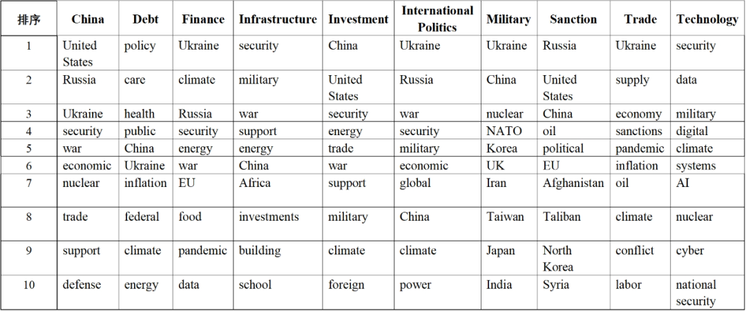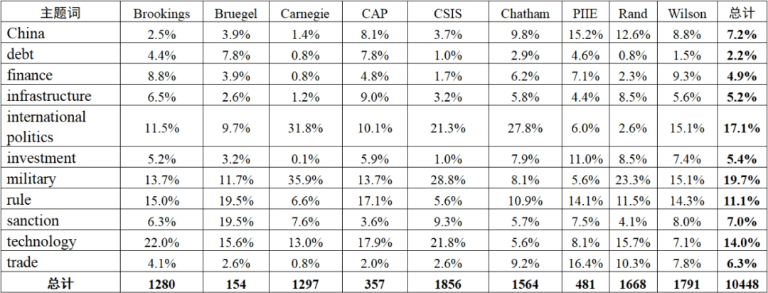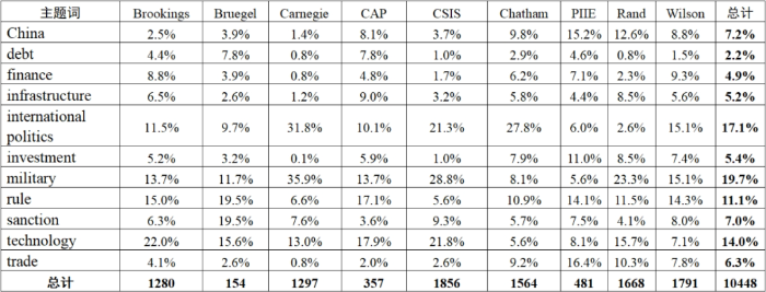 2022年美歐高端智庫(kù)研究 成果分析報(bào)告 ——基于10448篇報(bào)告的大數(shù)據(jù)分析 王一童 柴亞超 一、研究背景 美歐智庫(kù)是全球智庫(kù)體系中的重要組成部分,其發(fā)展起步較早,發(fā)展模式較好,行業(yè)規(guī)范更成熟,是美歐國(guó)家的重要政策智囊,在全球高端輿論體系中有著重要的地位??傮w來看,美歐智庫(kù)在數(shù)量和影響力方面處于世界領(lǐng)先地位,其發(fā)布的觀點(diǎn)、分析和評(píng)論也成為了當(dāng)下了解美歐國(guó)家政府內(nèi)部認(rèn)知和社會(huì)公共輿論的一扇重要窗口。 一般對(duì)于智庫(kù)的研究報(bào)告都以文獻(xiàn)閱讀、分析、總結(jié)為主,多針對(duì)一篇或幾篇報(bào)告進(jìn)行分析。這種研究方式的優(yōu)勢(shì)是分析更為透徹和深入,但是由于個(gè)人精力、關(guān)注方向的局限性,容易陷入“信息繭房”,對(duì)整體方向的把握比較散亂。課題研究組利用大數(shù)據(jù)的方法,對(duì)美歐智庫(kù)報(bào)告進(jìn)行批量下載處理、內(nèi)容分析、主題挖掘、重點(diǎn)提煉等,更好地掌握了解美歐國(guó)家對(duì)國(guó)際政治、經(jīng)濟(jì)貿(mào)易、中國(guó)發(fā)展等關(guān)鍵領(lǐng)域的認(rèn)知情況,有助于我國(guó)政府決策部門及時(shí)判斷和預(yù)測(cè)美歐國(guó)家對(duì)我國(guó)的政策戰(zhàn)略計(jì)劃,結(jié)合國(guó)內(nèi)實(shí)際情況制定應(yīng)對(duì)策略;有助于提升我國(guó)信息情報(bào)領(lǐng)域的決策參考服務(wù)水平,在國(guó)際社會(huì)中更好地樹立中國(guó)話語(yǔ)權(quán)。 二、研究方法 本研究選取9家全球最頂級(jí)智庫(kù),分別是美國(guó)布魯金斯學(xué)會(huì)(Brookings)、美國(guó)卡內(nèi)基國(guó)際和平基金會(huì)(Carnegie)、比利時(shí)布魯蓋爾研究所(Bruegel)、美國(guó)戰(zhàn)略與國(guó)際問題研究中心(CSIS)、英國(guó)皇家國(guó)際事務(wù)研究所(Chatham)、美國(guó)蘭德公司(Rand)、美國(guó)彼得森國(guó)際經(jīng)濟(jì)研究所(PIIE)、威爾遜中心(Wilson)和美國(guó)進(jìn)步中心(CAP)。 研究以網(wǎng)絡(luò)爬蟲的方法收集了以上9家智庫(kù)2022年全年關(guān)于中國(guó)、國(guó)際政治、產(chǎn)業(yè)投資、貿(mào)易、基礎(chǔ)設(shè)施、科技、軍事、金融、債務(wù)、規(guī)則、標(biāo)準(zhǔn)、制裁等相關(guān)領(lǐng)域的研究報(bào)告,共計(jì)10448篇。將美歐智庫(kù)涉華報(bào)告的研究趨勢(shì)、研究領(lǐng)域與關(guān)鍵詞共詞分析相結(jié)合。運(yùn)用計(jì)量分析法對(duì)美歐智庫(kù)報(bào)告的發(fā)文量、發(fā)文主題、詞頻、詞共現(xiàn)等進(jìn)行量化分析,并輔以共詞分析法對(duì)涉華報(bào)告的關(guān)鍵詞進(jìn)行分析。 三、智庫(kù)主要觀點(diǎn) (一)各智庫(kù)關(guān)注領(lǐng)域分析 2022年,各智庫(kù)與軍事、國(guó)際政治等相關(guān)的主題報(bào)告占比在三分之一左右,與貿(mào)易、制裁等相關(guān)的主題報(bào)告占比在四分之一左右,與基礎(chǔ)設(shè)施、投資、債務(wù)等相關(guān)的主題報(bào)告占比約占五分之一,與全球產(chǎn)業(yè)鏈供應(yīng)鏈重建主題相關(guān)的報(bào)告約占五分之一。不同主題下智庫(kù)關(guān)注的重點(diǎn)領(lǐng)域分析參見附件1。 1.布魯蓋爾:俄烏沖突 布魯蓋爾研究所注重俄烏沖突的研究。部分研究對(duì)俄烏沖突預(yù)期較為悲觀,認(rèn)為戰(zhàn)爭(zhēng)不僅導(dǎo)致歐洲歷史上最多的難民潮,還將在世界其他地區(qū)引發(fā)一系列連鎖問題,如同當(dāng)年ISIS恐怖武裝在復(fù)雜的地緣沖突中悄然蔓延崛起。在俄烏沖突與歐盟和中國(guó)關(guān)系的分析中,布魯蓋爾指出,“只要烏克蘭戰(zhàn)爭(zhēng)繼續(xù),歐洲對(duì)中國(guó)的看法將保持普遍的負(fù)面態(tài)度”。這將對(duì)“一帶一路”合作,包括中歐合作,帶來一定負(fù)面影響。在西方看來,盡管中國(guó)在某些方面對(duì)俄羅斯持謹(jǐn)慎態(tài)度,但并沒有像西方一樣反對(duì)和制裁俄羅斯,甚至借助俄烏沖突在地緣政治中獲得了更大的影響力和利益。布魯蓋爾認(rèn)為,中國(guó)不希望被孤立,而希望保持與西方國(guó)家的良好經(jīng)濟(jì)關(guān)系,所以如何處理中俄關(guān)系,如何保持立場(chǎng)的一貫性、保持外交平衡,是對(duì)中國(guó)高層領(lǐng)導(dǎo)外交智慧的考驗(yàn)。 2.布魯金斯:科技與財(cái)政 布魯金斯學(xué)會(huì)的研究領(lǐng)域最為均衡,其研究包括追蹤高新技術(shù)產(chǎn)品的全球供應(yīng)鏈和如何通過有效市場(chǎng)作用來支持經(jīng)濟(jì)發(fā)展。布魯金斯認(rèn)為,在同中國(guó)的經(jīng)濟(jì)競(jìng)爭(zhēng)過程中,美國(guó)也在同步推進(jìn)與其他合作伙伴、盟友的一體化。一是在科學(xué)技術(shù)層面,二是國(guó)家安全層面。對(duì)美國(guó)而言,國(guó)家安全、經(jīng)濟(jì)發(fā)展和科學(xué)技術(shù)等各個(gè)方向之間的戰(zhàn)略思路正在快速統(tǒng)一。當(dāng)前美國(guó)和歐盟逐步在對(duì)外政策上達(dá)成了共識(shí),從國(guó)家利益最大化的角度考慮,出境投資審查應(yīng)當(dāng)針對(duì)國(guó)家安全的關(guān)鍵領(lǐng)域,而非所有領(lǐng)域。布魯金斯學(xué)會(huì)與復(fù)旦大學(xué)等科研院所聯(lián)系