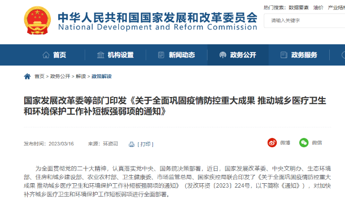 統籌謀劃 重點突破 加快補齊城鄉醫療衛生和環境保護短板弱項 ——《關于全面鞏固疫情防控重大成果 推動城鄉醫療衛生和環境保護工作補短板強弱項的通知》解讀 中國國際工程咨詢有限公司 潘小海 全面鞏固疫情防控重大成果,加強醫療衛生和環境保護工作是最大程度保護人民生命安全和身體健康,最大限度減少疫情對經濟社會發展的影響,推動經濟平穩健康發展的重要舉措。近日,國家發展改革委、中央文明辦、生態環境部、住房和城鄉建設部、農業農村部、國家衛生健康委、市場監管總局、國家疾控局聯合印發《關于全面鞏固疫情防控重大成果 推動城鄉醫療衛生和環境保護工作補短板強弱項的通知》(發改環資〔2023〕224號,以下簡稱《通知》),對全面鞏固疫情防控重大成果,加快補齊城鄉醫療衛生和環境保護短板弱項作出系統部署。《通知》是落實黨的二十大精神的具體舉措,對推動城鄉醫療衛生和環境保護工作取得更大進展,加快建設健康中國、美麗中國具有重要意義。 一、充分認識鞏固疫情防控重大成果,加快補齊城鄉醫療衛生和環境保護短板弱項的重要意義 (一)充分認識這是做好新階段疫情防控的迫切需要。3年多來,以習近平同志為核心的黨中央團結帶領全黨全國各族人民同心抗疫,以強烈的歷史擔當和強大的戰略定力,因時因勢優化調整防控政策措施,高效統籌疫情防控和經濟社會發展,取得疫情防控重大決定性勝利。當前全國疫情防控形勢總體向好,平穩進入“乙類乙管”常態化防控階段,但全球疫情仍在流行,病毒還在不斷變異,全面鞏固疫情防控重大成果,加強疫情監測和常態化預警處置能力建設,加強重點人群健康監測設施和能力,抓緊補齊重點環節防控設施短板,是新階段抓實抓細疫情防控工作的具體舉措,是做好新階段疫情防控工作的迫切需要。 (二)充分認識這是保障人民群眾生命健康的重要舉措。3年以來,在病毒猖獗時期,我國頂住了一輪又一輪疫情沖擊,成功避免了致病力較強、致死率較高的病毒株的廣泛流行,最大程度降低了新冠病毒感染造成的重癥率和病亡率,有效保護了人民群眾生命安全和身體健康。但同時,疫情防控中我國也暴露出重癥救治壓力大、社區醫院分流能力有待加強、重點人群及農村地區救治任務艱巨等問題。要加快補齊醫療衛生短板弱項,建強醫療衛生服務網絡設施,強化醫療集團網絡化布局管理機制,加強醫療物資資源統籌調配能力建設,做到醫療衛生服務資源跟得上、機制可聯動,平急結合、系統高效,切實維護人民群眾健康福祉。 (三)充分認識這是共謀綠色生活共建美麗家園的重要途徑。良好生態環境是最普惠的民生福祉,是人民群眾迫切需要的公共產品。黨的十八大以來,以習近平同志為核心的黨中央把生態文明建設擺在全局突出位置,開展一系列根本性、開創性、長遠性工作,我國生態環境質量改善成效顯著,人民群眾獲得感幸福感安全感明顯增強。但同時,我國生態環境保護結構性、根源性、趨勢性壓力整體尚未緩解,與人民群眾日常生活息息相關的城鄉環境衛生、污水垃圾等環境基礎設施建設還存在短板,全社會綠色健康生活方式尚未廣泛形成。要深入開展愛國衛生運動,補齊人民群眾身邊的污水垃圾等環境基礎設施短板,提升全民綠色健康意識,推動共謀綠色生活共建美麗家園。 二、準確把握全面鞏固疫情防控重大成果,加快補齊城鄉醫療衛生和環境保護短板弱項的重點任務 《通知》堅持統籌推進、重點突破,聚焦我國疫情防控過程中暴露出的城鄉醫療衛生和環境保護工作短板弱項,以能力建設為主線,從堅決鞏固住來之不易的疫情防控重大成果、深入開展愛國衛生運動、加快完善環境基礎設施、大力倡導綠色健康生活方式等方面提出12項重點任務,為城鄉醫療衛生和環境保護工作補短板強弱項提供了行動指引。 (一)突出能力建設。一是在鞏固疫情防控成果方面,《通知》提出要加強重點機構和大型場所人員的健康監測設施和能力、醫療衛生服務能力、醫療物資資源統籌調配能力以及動態監測醫療資源使用能力建設;二是在愛國衛生運動方面,《通知》提出要完善街道社區、鄉村的環境衛生設施和保潔制度,提升環境衛生整治能力,推動組建居民健康管理互助小組,提高基層公共衛生工作能力水平;三是在環境基礎設施方面,《通知》提出要加強污水收集處理、生活垃圾分類和處理、醫廢危廢處置等能力建設。 (二)突出統籌推進。一是突出平急統籌,《通知》提出要抓好常態化分級分流醫療衛生體系建設,建強以公立醫療機構為主體的三級醫療衛生服務網絡,保障人民群眾日常就醫用藥需求。同時要推進國家緊急醫學救援基地、國家重大傳染病防控救治基地、國家區域公共衛生中心建設,提升我國公共衛生突發事件緊急醫學救援水平和重大傳染病防治能力。二是突出城鄉統籌,《通知》提出要全面改善城鄉環境衛生,鼓勵有條件的污水處理廠、生活垃圾焚燒廠等設施覆蓋范圍向鄉村延伸,協同推進農村有機生活垃圾、廁所糞污等資源化處理利用,健全偏遠地區醫療廢物收集轉運體系。 (三)突出重點環節。一是針對“一老一小”等重點人群,《通知》提出要加強養老機構、醫療機構、學校等重點機構健康監測設施和能力建設,根據病毒變異和疫苗保護情況,科學謀劃和完善疫苗接