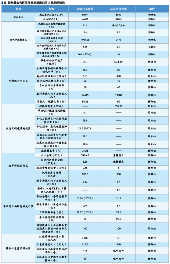 探索革命老區振興發展新路徑 ——《贛州革命老區高質量發展示范區發展規劃》解讀 田煜 董繼紅 贛州革命老區是土地革命戰爭時期中央蘇區的主體和核心區域,中華蘇維埃共和國在此奠基,中央紅軍氣壯山河的二萬五千里長征從瑞金、于都等地出發,艱苦卓絕的南方三年游擊戰爭在贛南山區浴血堅持,以毛澤東同志為代表的老一輩無產階級革命家在這里留下閃光足跡。黨中央高度關注贛州革命老區振興發展,在習近平總書記的親自關心和推動下,2012年6月,國務院出臺《關于支持贛南等原中央蘇區振興發展的若干意見》,開啟了贛南蘇區振興發展的嶄新篇章。 2021年1月,國務院出臺《關于新時代支持革命老區振興發展的意見》,提出研究支持贛州、三明等城市建設革命老區高質量發展示范區。2022年3月,國務院批復同意《贛州革命老區高質量發展示范區建設方案》。近期,經江西省人民政府同意,《贛州革命老區高質量發展示范區發展規劃》(以下簡稱《規劃》)正式印發。《規劃》明確了示范區建設的戰略目標、重點任務和支持政策,為贛州在全國革命老區高質量發展上作示范、勇爭先繪就了“路線圖”“施工圖”。 01 《規劃》為贛南蘇區振興發展指明了新發展階段的行動目標 黨的十八大以來,在黨中央堅強領導和關心關懷下,在中央國家機關及有關單位的鼎力支持下,贛州經濟社會發展取得歷史性成就。經過十年振興發展,經濟實力大步跨越,2012-2021年,贛州市地區生產總值從1700億元增至3658億元,年均增速9.2%,高于同期全國、全省水平2.5、0.5個百分點,人均GDP與全國平均水平的差距縮小了10.8個百分點;特色產業揚優成勢,營商環境持續優化,2022年,實際利用外資3.73億美元、進出口總額1033.1億元,在全國革命老區重點城市中位居前列。生態屏障持續筑牢,水土保持生態治理“贛州模式”、山水林田湖草沙綜合治理“尋烏經驗”在全國推廣。贛州人民堅定執著聽黨話、感黨恩、跟黨走,紅色基因薪火相傳,煥發新的時代榮光。 立足新階段,《規劃》錨定2035年與全國同步基本實現社會主義現代化的遠景目標,綜合考慮贛州市發展條件和外部環境,緊密銜接“十四五”規劃綱要及各領域專項規劃,在綜合實力、產業發展、鄉村振興、生態文明、改革開放、共同富裕、紅色傳承7個方面設置了36項主要指標。指標選取緊扣“6個區”戰略定位和“十四五”階段性任務,突出代表性,同時有利于考核監測任務的落實情況。在確定經濟增長目標時,《規劃》對標“十四五”規劃綱要,同時結合2020-2022年贛州市實際經濟增長情況,提出了到2025年GDP突破5500億元的預期目標。在設置反映產業發展的相關指標時,《規劃》充分對接經濟高質量發展內涵,納入數字經濟、科技創新等反映質量效益的指標,體現了贛州革命老區堅定不移強化科技創新,著力提升產業層次的勇氣和決心。 資料來源:《贛州革命老區高質量發展示范區發展規劃》 02 《規劃》聚焦新發展理念因地制宜謀劃了作示范的六大領域 立足新起點,奮進新征程,贛州堅持在推進中國式現代化的偉大進程中,探索革命老區振興發展新路徑。《規劃》圍繞“六個作示范”領域,細化、實化了構建現代產業體系、全面推進鄉村振興、建設美麗中國“贛州樣板”、堅持深化改革開放、健全公共服務體系、賡續紅色血脈六個方面的重點任務。 (一)構建現代產業體系,推進產業創新發展先行示范。習近平總書記指出,要堅持面向世界科技前沿、面向經濟主戰場、面向國家重大需求、面向人民生命健康,加快實現高水平科技自立自強。近年來,贛州革命老區堅定不移走集群發展、創新發展、融合發展道路,加快培育特色優勢產業集群,現代家居產業從百億“草根經濟”躍升為2500億元的產業集群,稀土鎢新型功能材料產業集群獲批全國首批戰略性新興產業集群,中科院贛江創新研究院、中國稀土集團落戶贛州,填補了江西無國家級大院大所和央企總部的空白。為加快推動贛州革命老區開辟經濟發展的新領域新賽道、塑造發展新動能新優勢,《規劃》部署了區域性科技創新中心、壯大更具影響力的現代產業集群、做優做強數字經濟等3大重點任務。重點提出高質量推進中科院贛江創新研究院建設,支持贛州高新區創建國家自主創新示范區、雙創示范基地,支持贛州創建國家新型工業化產業示范基地、國家級工業設計中心,推進贛深數字經濟走廊建設,支持贛州建設國際互聯網數據專用通道等舉措。 中國稀土集團已在贛州掛牌成立。(于垚峰 攝) (二)深入實施鄉村振興戰略,推進城鄉協調發展先行示范。習近平總書記指出,全面推進鄉村振興是“三農”工作重心的歷史性轉移。10年來,贛州革命老區推動域內11個貧困縣全部脫貧摘帽,114.33萬農村建檔立卡貧困人口全部脫貧,改造農村危舊房土坯房69.52萬戶,解決農村安全飲水近300萬人,新建改造農村公路2.7萬公里,農民人均可支配收入增幅連續9年領跑全省、增長2.1倍,贛南臍橙品牌價值連續六年穩居全國水果類第一,贛南茶油晉級地理標志產品區域品牌榜50強。然而受歷史、區位等因素影響,贛州革命老區發展不平衡不充分的問題仍然突出,脫貧摘帽不是終點,而是新生活、新奮斗的起點。圍繞鄉村振興和新型城鎮化雙輪驅動,加快建設革命老區鄉村振興示范區,《規劃》部署了鞏固拓展脫貧攻