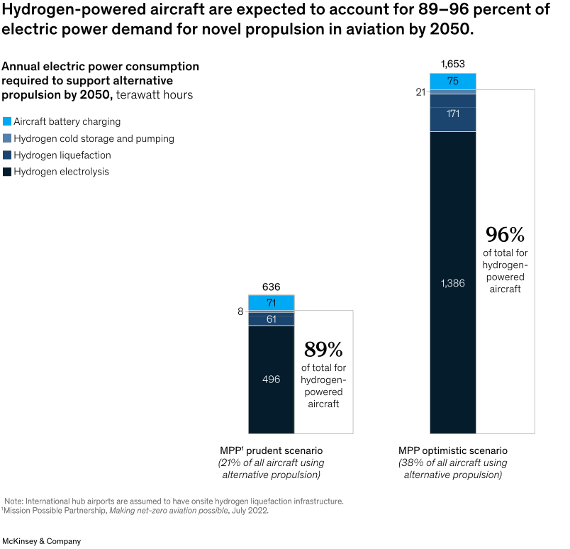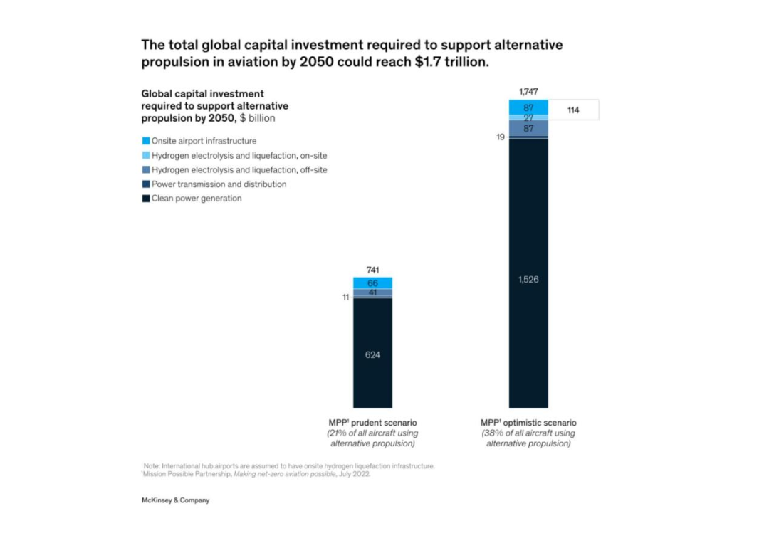 隨著對解決航空業氣候影響的解決方案的尋求變得更加迫切,人們對例如氫氣、電池電力和混合電力驅動飛機等新型推進技術產生了極大的興趣。根據MPP對航空業能源的估計,到2050年,電池電力和氫動力飛機可能占所有飛機的21%-38%,占該行業整體能源需求的15%-34%。雖然時間上可能感覺很遙遠,但這一新技術將在這十年內出現。 針對這些基礎設施的變化,以及機場和其他利益相關方如何開始準備,仍存在不確定性。近期,麥肯錫發布了《瞄準低碳:為電池和氫動力飛機提供基礎設施》的報告,旨在幫助人們了解影響新型推進器的一些關鍵考慮因素。