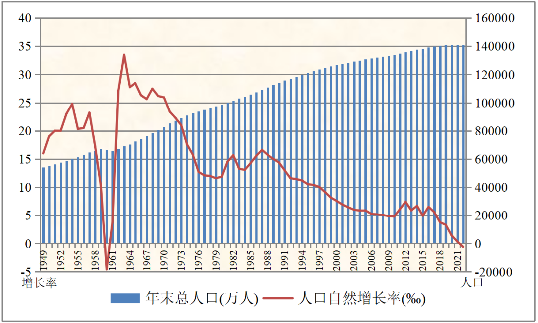 圖4 1949-2022年全國年末總人口與人口自然增長率變化