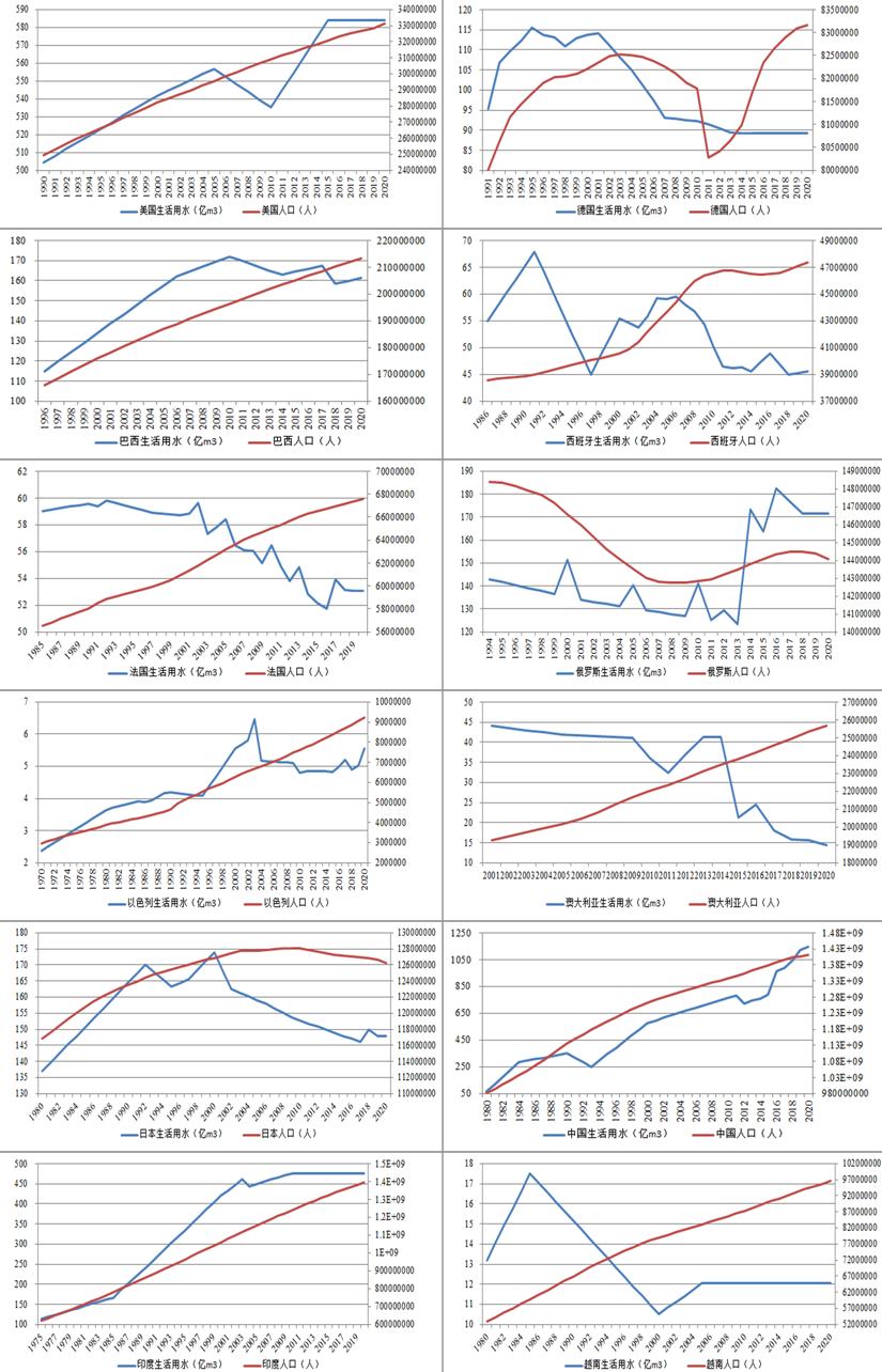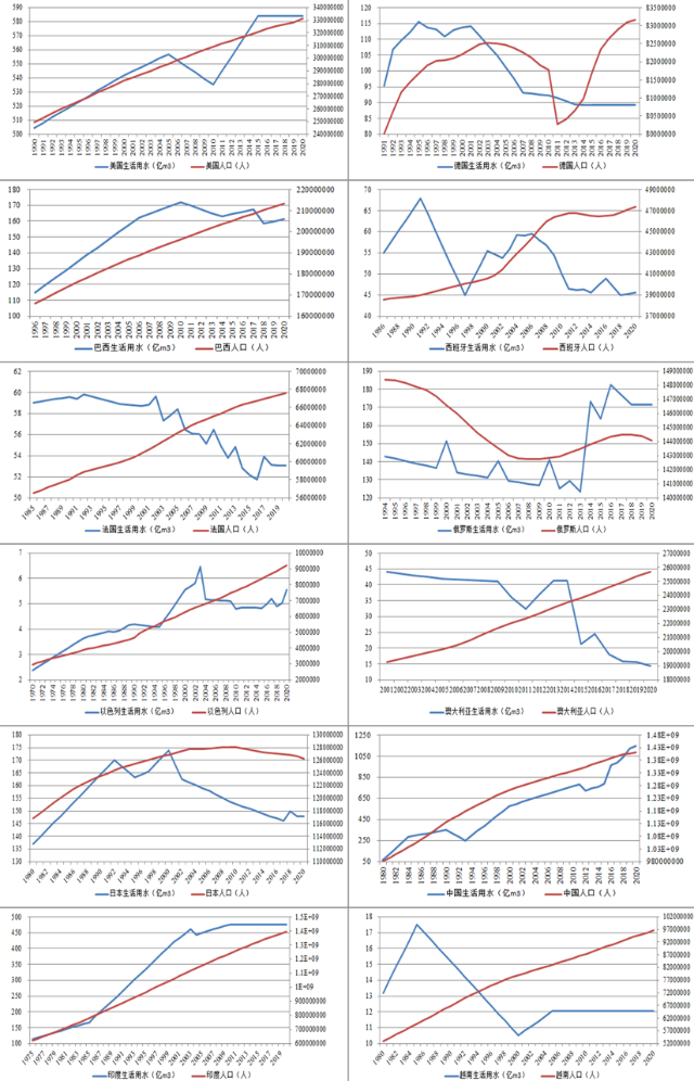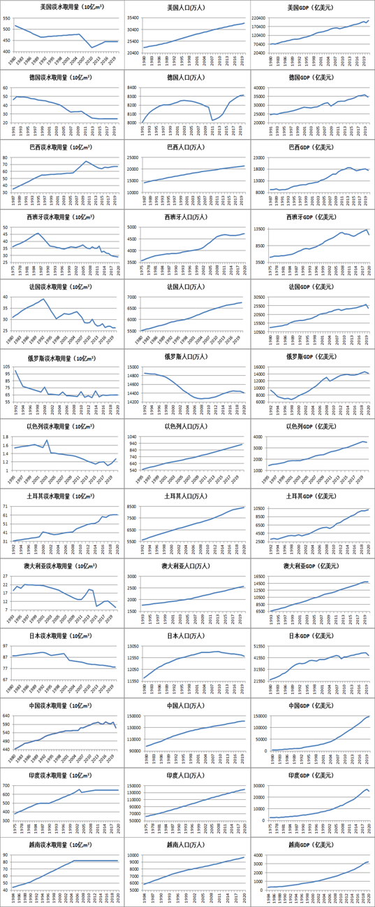 從世界各國淡水取用量和人口、經濟發展關系看,通過分析180余個國家淡水取用情況,與2000年比,2020年40多個國家淡水取用量總體呈降低態勢,70余個國家總體呈增長態勢(按照增幅超過10%統計),其余國家較為平穩。而2015年以來,包括我國在內約130個國家用水態勢平穩或穩中有降。