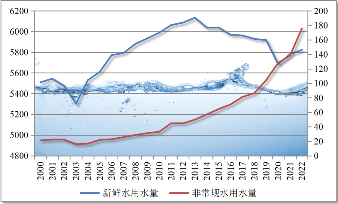 圖6 2000-2022年全國用水總量中新鮮水和非常規水變化(單位:億m3)