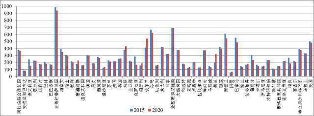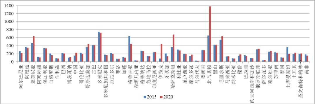 圖9 2015和2020年中等高收入國家人均生活用水量對比圖(基數為淡水取用量,L/d)