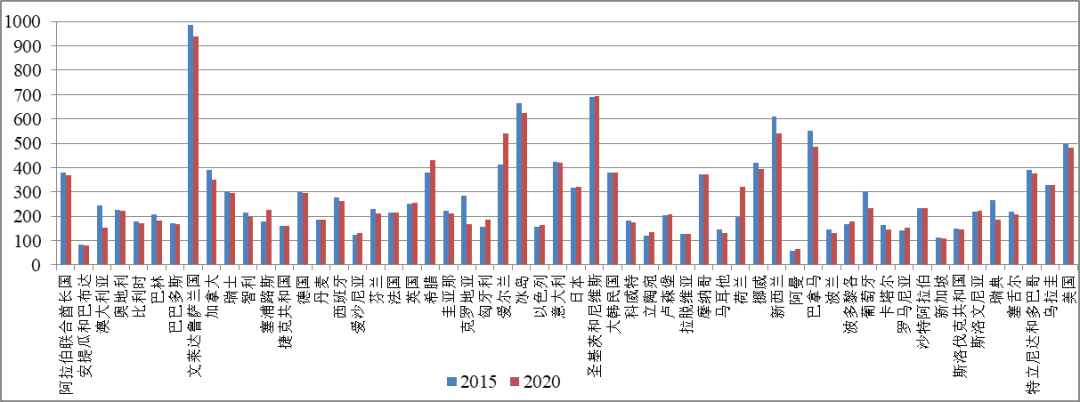 圖10 2015和2020年高收入國家人均生活用水量對比圖(基數為淡水取用量,L/d)