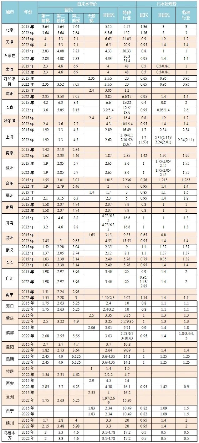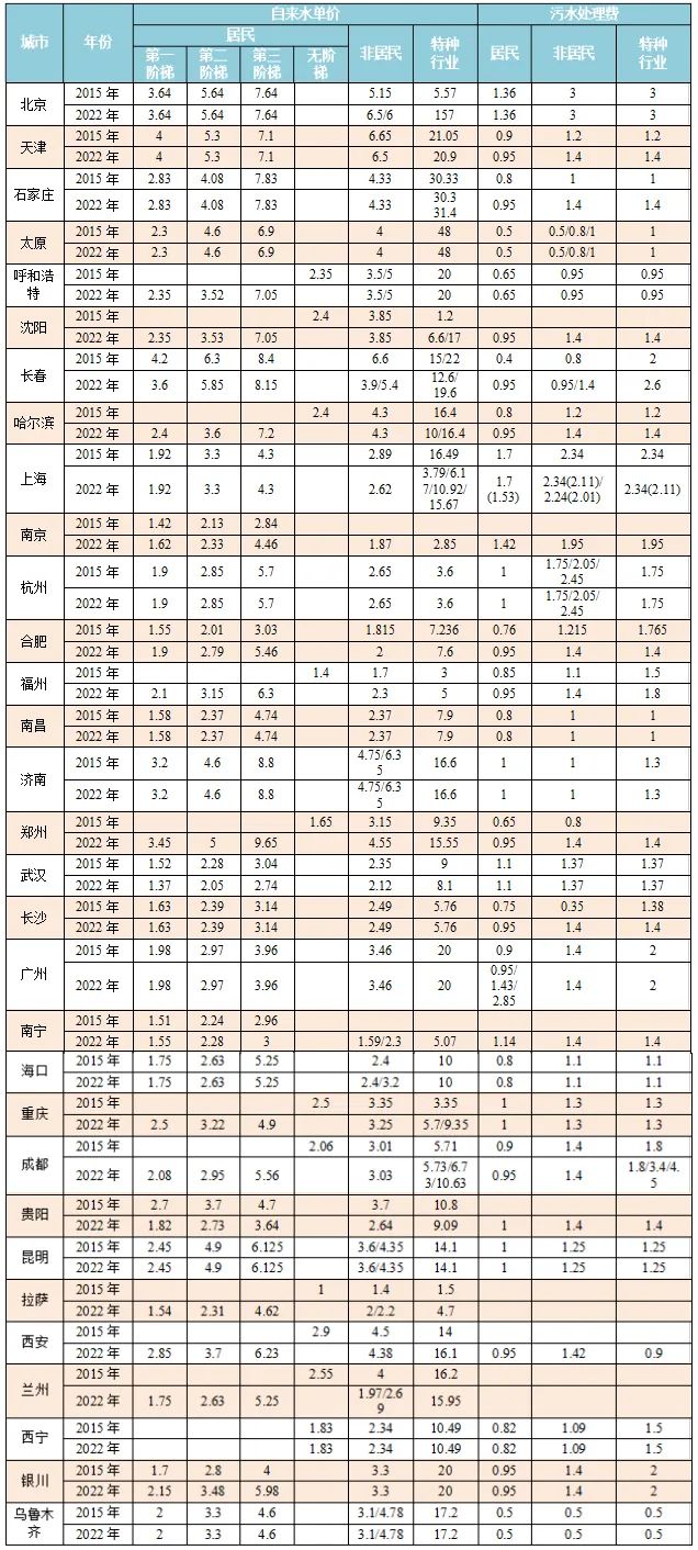表3 2015年、2022年31個城市自來水單價和污水處理費統計對比表[4]    單位:元/m3