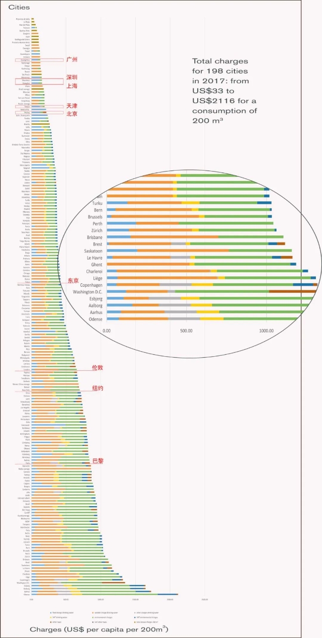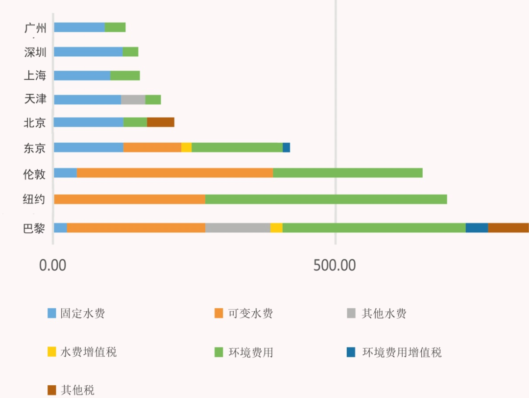 有研究提出,紐約、倫敦、東京、巴黎和新加坡家庭水費支出占城市家庭收入的比例介于0.58%~1.10%,平均為0.76%,國內典型城鎮介于0.24%~0.42%,國內明顯低于國際。IWA Statistics and Economics組織編寫了International Statistics for Water Services 2018并于去年10月的國際水協世界水大會上正式發布,總結了2017年39個國家198個城市水費情況,見圖12。按水費從小到大進行排序,北京排在第33位(廣州、深圳、上海、天津排位更靠前)。選擇紐約、倫敦、東京、巴黎等國際典型城市與我國典型城市進一步比對,從水費組成看,我國水價和排污費均明顯偏低,見圖13。因此,從資源保護、環境治理、高質量發展要求等方面看,我國水價調整勢在必行。農業是用水大戶,加快推進農業水價綜合改革也是節水潛力所在。未來進一步落實兩手發力,在價格杠桿調節供求后,提高用水效率、進一步節水還有空間。