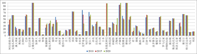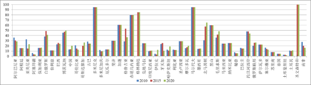 圖7 2010、2015和2020年中等高收入國家生活占抽取淡水資源百分比(%)