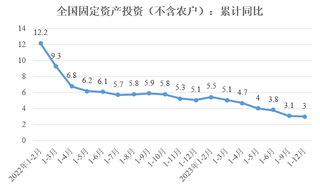 2023年,我國固定資產投資(不含農戶)同比增長3%,增速較上年下降2.1個百分點,較前三季度、上半年、一季度分別下降0.1個、0.8個、2.1個百分點,固定資產投資增速逐季放緩。1—11月,建安工程、設備工器具購置、其他費用分別增長2.1%、6.7%、3.1%,建安工程投資增速明顯低于設備工器具購置投資增速,說明房屋、建筑物和設備裝置安裝等投資的活躍程度有所下降,體現技術水平的設備工器具投入增長加快。