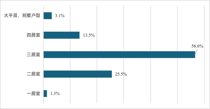 一是商品住房需求部分,在新房和二手房價格普遍下跌的趨勢下,青年購房需求出現分化。調查顯示,首先,部分青年群體受就業市場挑戰、婚育情況變化等因素影響,難以承受商品房價格,也避免承擔長期的房貸負擔;其次,部分青年在擁有一定購房實力時,仍然選擇租房居住、持幣待購,規避房價下跌過程中家庭資產損失的風險;再次,部分具有經濟實力的青年群體開始關注居住環境的改善,《2023年青年置業報告》顯示,改善居住環境已經成為青年置業的主要動力,如下圖1所示,46.7%的受訪青年為了改善居住環境而購房。同時,如下圖2所示,56.6%的受訪青年愿意購買三居室。因此,在商品房部分應進一步關注青年群體分化的購房需求,繼續打造更加精準的支持政策和供給產品。