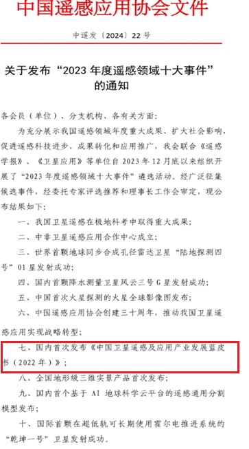 《中國衛星遙感及應用產業發展藍皮書(2022年)》是我國首次對中國衛星遙感及應用產業國民經濟貢獻度的定量化呈現,對于有效支撐政府主管部門的投資決策和指導商業航天發展、引導社會資本參與航天事業等都具有重大意義,是衛星遙感及應用產業高質量發展的重要里程碑。“國內首次發布《中國衛星遙感及應用產業發展藍皮書(2022年)》” 入選中國遙感應用協會評選的“2023年度遙感領域十大事件”。