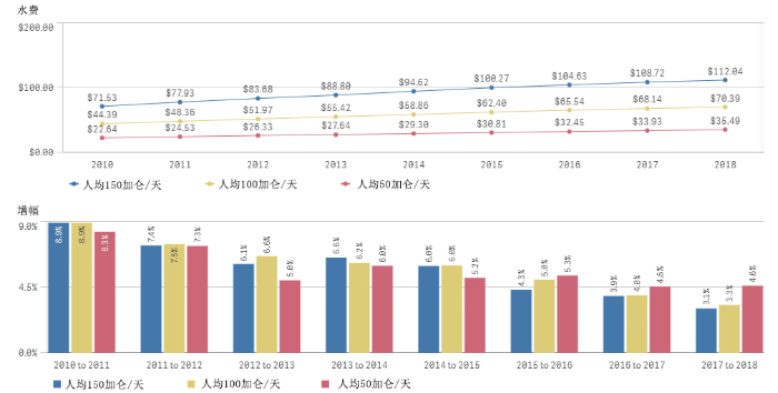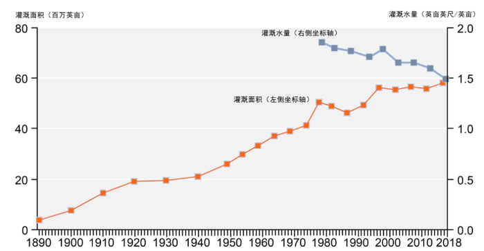 編者按:《2021年聯(lián)合國世界水發(fā)展報(bào)告》提出,全球新水使用量在過去100年中增加了6倍,自20世紀(jì)80年代以來以每年約1%的速度增加。預(yù)計(jì)至2050年全球用水量仍將以類似的速度繼續(xù)增長,且增長主要集中在中低收入國家,尤其是新興經(jīng)濟(jì)體[1]。 為進(jìn)一步把握好我國水資源未來需求趨勢(shì),我們深入分析研究了一些典型國家的用水態(tài)勢(shì)變化情況及水資源管理經(jīng)驗(yàn),以期為我國做好水資源需求研判以及科學(xué)指導(dǎo)水工程規(guī)劃建設(shè)提供參考。本公眾號(hào)將研究成果以系列文章的方式陸續(xù)刊發(fā),本文為系列研究之一,供業(yè)界同仁參考。 美國用水變化態(tài)勢(shì)對(duì)我國的啟示 姜富華 邢智慧 紀(jì)興華 一、1950年以來美國用水量變化態(tài)勢(shì)分析 (一)1950年以來美國用水量變化情況 2015年美國總用水量約為4449億立方米,其中淡水約為3883億立方米,占比為87%;咸水約為566億立方米,占比為13%。 從1950年至2015年間美國總用水量的變化情況看,其總體呈先增后降的態(tài)勢(shì)(見圖1)。以1980年為轉(zhuǎn)折點(diǎn),1950-1980年間美國總用水量隨著人口和經(jīng)濟(jì)的增長持續(xù)增長,1980年美國總用水量約為1950年的2.4倍;1980年以后,受產(chǎn)業(yè)結(jié)構(gòu)調(diào)整、技術(shù)進(jìn)步、用水效率提高等因素綜合影響,美國總用水量呈現(xiàn)了總體下降的態(tài)勢(shì),2015年總用水量比用水高峰的1980年減少了約25%。 美國淡水取用量與總用水量變化態(tài)勢(shì)一致(見圖2)。1980-2015年間美國淡水總用水量下降了27%,此期間美國人口增長了約42%,GDP增長了5倍以上[2]。 數(shù)據(jù)來源:美國地質(zhì)調(diào)查局統(tǒng)計(jì)。 注:①不同時(shí)段取水量統(tǒng)計(jì)口徑略有差異;②取水量等于毛用水量。 圖1 1950-2015年美國總?cè)∮盟考胺诸惾∮盟孔兓瘧B(tài)勢(shì) 數(shù)據(jù)來源:美國地質(zhì)調(diào)查局統(tǒng)計(jì)。 圖2 1950-2015年美國淡水取用水量與人口變化態(tài)勢(shì) 有研究[3]繪制了以1950年為基準(zhǔn),至2010年美國GDP與用水量間的關(guān)系變化情況圖(見圖3)。藍(lán)色線為實(shí)際GDP變化,橙色線為實(shí)際用水量變化,灰色線為考慮產(chǎn)業(yè)結(jié)構(gòu)變化、不考慮技術(shù)改進(jìn)情況下的預(yù)測(cè)用水變化。藍(lán)色線與橙色線的剪刀走向表明:早在1980年,美國用水量已與GDP脫鉤。藍(lán)色線與灰色線、灰色線與橙色線的剪刀走向表明:導(dǎo)致脫鉤的重要因素是用水效率提升和經(jīng)濟(jì)結(jié)構(gòu)變化。 數(shù)據(jù)來源:數(shù)據(jù)來自[3];1950=1 圖3 1950-2010年美國總用水量與經(jīng)濟(jì)變化關(guān)系分析 (二)主要行業(yè)用水量變化情況 美國用水類別中,熱電、灌溉、公共和自供工業(yè)用水量是排在前4名的用水戶,其用水總量占美國總用水量的比重超過90%,見圖4。本文重點(diǎn)分析多年來美國熱電、灌溉、公共和自供工業(yè)用水的變化情況。 數(shù)據(jù)來源:美國地質(zhì)調(diào)查局。 圖4 2015年美國分類取用水量統(tǒng)計(jì) 1.熱電用水變化態(tài)勢(shì) 熱電是美國最大的用水對(duì)象。2015年美國熱電用水量約為1838億立方米,占總用水量的41%左右,見圖5。美國熱電用水基本來自地表水,且以淡水為主。2015年美國熱電用水量比2010年降低18%左右,用水效率由2010年的71.9升/千瓦時(shí)降低到2015年的56.8升/千瓦時(shí)。 數(shù)據(jù)來源:美國地質(zhì)調(diào)查局。 圖5 1950-2015年美國熱電用水量變化態(tài)勢(shì) 2.灌溉用水變化態(tài)勢(shì) 美國灌溉用水量占總用水量的40%左右,僅次于熱電用水。2015年美國灌溉面積超過3.5億畝,其中噴灌、微灌面積比重分別為55%和8.6%左右,灌溉總用水量約為1630億立方米(占總用水量的37%左右),地表和地下水源灌溉供水比重分別為52%和48%。由于降雨豐枯變化,美國灌溉水量年際間有波動(dòng),但從大的變化趨勢(shì)看,1980年以來總體呈下降趨勢(shì),2015年灌溉水量比1980年減少了21%,見圖6。 數(shù)據(jù)來源:美國地質(zhì)調(diào)查局。 圖6 1950-2015年美國灌溉用水量變化態(tài)勢(shì) 灌溉用水受水資源條件、灌溉面積、種植結(jié)構(gòu)、灌溉設(shè)施、灌溉效率等多種因素影響。據(jù)美國農(nóng)業(yè)部統(tǒng)計(jì),美國灌溉面積快速增長,從1890年的不足1821萬畝增長到2017年的3.52億畝左右,見圖7。但與此同時(shí),實(shí)際灌溉用水強(qiáng)度有所下降,1969-2017年單位面積平均灌溉水量從406立方米/畝下降至304立方米/畝,這是農(nóng)業(yè)種植模式調(diào)整、灌溉設(shè)施與技術(shù)采用和灌溉效率提高等綜合作用的結(jié)果。 數(shù)據(jù)來源:美國農(nóng)業(yè)部。 圖7 1890-2018年美國灌溉面積和單位面積灌溉用水量變化態(tài)勢(shì) 美國灌溉用水結(jié)構(gòu)不斷變化,主要表現(xiàn)為玉米和大豆的灌溉面積顯著增加。1964年美國主要灌溉農(nóng)作物是棉花和牧草,玉米和大豆加起來不到1518萬畝。2017年玉米灌溉面積超過7284萬畝,大豆灌溉面積超過5463萬畝,見圖8。 數(shù)據(jù)來源:美國農(nóng)業(yè)部。 圖8 1964-2017年美國主要農(nóng)作物灌溉面積變化態(tài)勢(shì) 同時(shí),美國越來越注重高效節(jié)水灌溉技術(shù)的運(yùn)用。美國農(nóng)業(yè