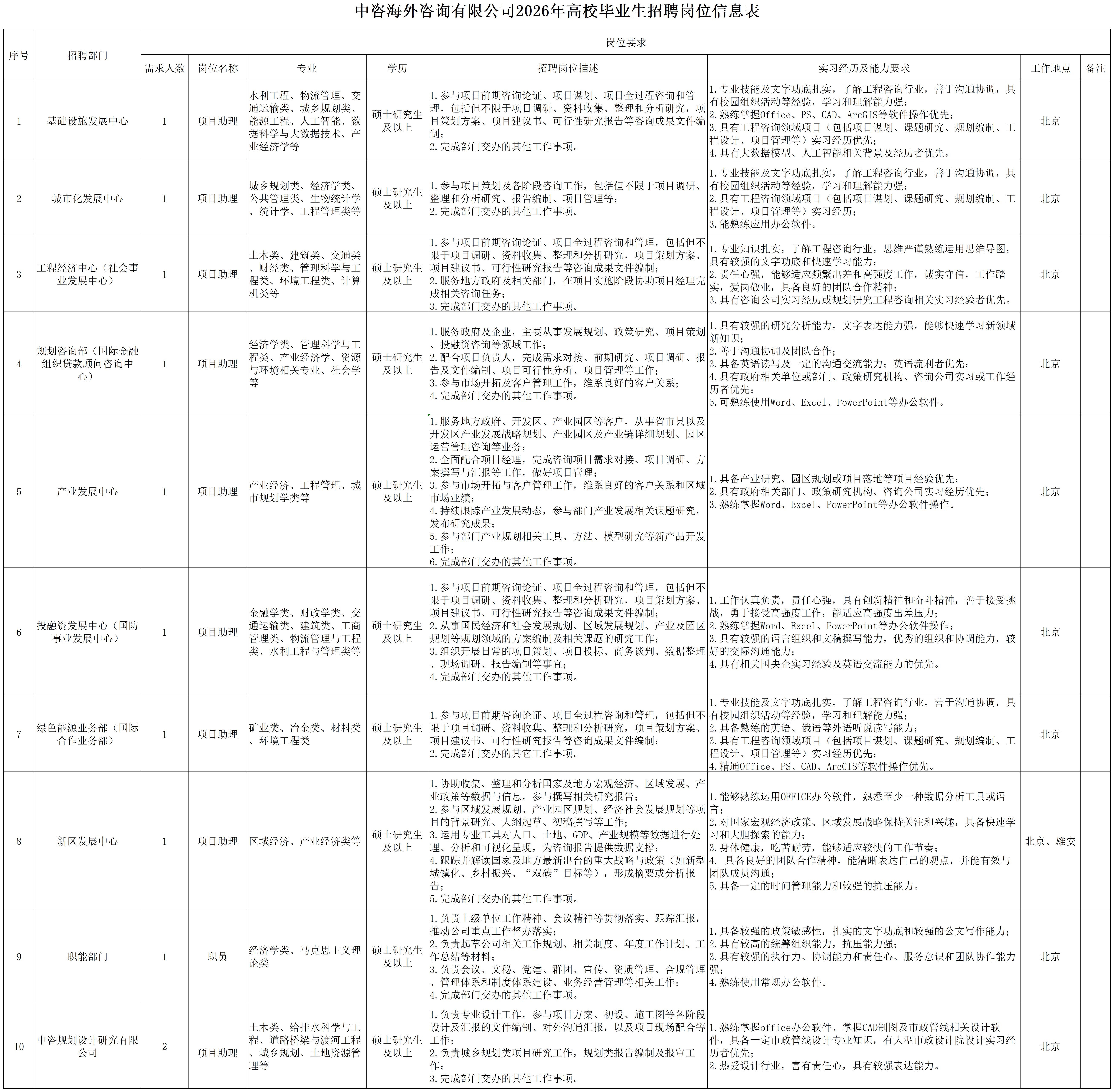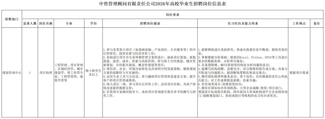 一、公司簡介 中咨工程管理咨詢有限公司(簡稱中咨管理)成立于1989年,是中國國際工程咨詢有限公司的核心骨干子公司,注冊資金1.55億元?,F有各項資質證書持證2800余冊,中高級職稱比例超50%。 中咨管理公司是國內從事工程管理類業務最早、規模最大、行業最廣、業績最多的企業之一,具有工程咨詢甲級資信、工程監理綜合資質以及設備、公路工程、地質災害防治工程、人民防空工程等多項專業監理甲級資質,并列入政府采購招標代理機構和中央投資項目招標代理機構名單。業務涵蓋工程前期咨詢、項目管理、項目代建、招標代理、造價咨詢、工程監理、設備監理、設計優化、工程質量安全評估咨詢等項目全過程咨詢服務,涉及房屋建筑、交通、石化、水利、電力、冶煉、礦山、市政、生態環境、通信和信息化等多個行業。業務遍布全國及全球近50個國家和地區,累計服務各類咨詢管理項目超過1萬個,涉及工程建設投資近5萬億元。曾榮獲56項中國建設工程魯班獎、15項中國土木工程詹天佑獎、64項國家優質工程獎、23項中國鋼結構金獎以及各類省級或行業獎項500余項。 經過30余年的不懈努力,我們積累了豐富的工程管理經驗,為各類工程建設項目保駕護航,“中咨管理”品牌成為行業的一面旗幟。我們崇尚簡單、包容、共享的理念,秉持創造價值、貢獻社會的使命和專業創造精品、價值成就客戶的核心價值觀,為成為全過程工程管理咨詢的領先者而奮斗。優秀的你值得更好的平臺,加入我們,攜手共創新篇章! 二、應聘條件 (一)2026年全日制本科及以上應屆畢業生。 (二)年齡要求:本科生26周歲及以下(2000年1月1日后出生),碩士研究生30周歲及以下(1996年1月1日后出生)。 (三)在校就讀期間無在職工作經歷,無社保繳納記錄和派遣落戶記錄。 (四)成績優秀,人品端正,積極進取,愿與公司共改革、奮進。 (五)具備扎實的專業理論知識和良好的溝通能力,實踐能力較強。 (六)熟練使用各類辦公軟件。 (七)簡歷需注明出生日期、生源地(即入學前戶籍所在地)。 三、應聘程序 發布招聘公告→簡歷投遞→簡歷篩選→筆試→面試→確定人選并公示→發放錄用通知。 四、崗位信息 五、報名方式 本次招聘報名采取在線填報方式進行:應聘者請使用Chrome內核瀏覽器(如:Chrome瀏覽器、360瀏覽器、百度瀏覽器、搜狗瀏覽器、UC瀏覽器等)登錄網站報名,網站鏈接:https://hcmcloud.ciecc.com.cn/recruit/#/index 或使用手機掃描二維碼: 中咨工程有限公司 一、 公司簡介 中咨工程有限公司成立于2010年,是中國國際工程咨詢有限公司(簡稱中咨公司)的控股子公司,由中咨公司和中國廣核電力股份有限公司合資成立。 公司作為中咨公司工程管理業務板塊的核心成員,主營業務為全過程工程管理(咨詢)服務業務,包括全過程中的各節點業務(1+X),業務范圍涉及石化、核電、冶金、交通和民用市政等多個領域行業工程項目的前期咨詢及咨詢管理、勘察管理、設計管理、監理、采購管理、造價咨詢、建造過程管理、項目管理(IPMT、PMC等)、項目代建和技術服務等。 公司以為國家、社會和股東創造價值為己任,以兩大股東提供的廣闊市場機遇和成熟先進的管理體系為發展驅動力,通過積極參與市場競爭,努力培育公司核心競爭能力,打造一支特別能戰斗的具有復合型人才的專業化隊伍,矢志發展成為具備承接大中型全過程工程管理(咨詢)服務業務能力的、具有國際競爭力的工程公司。 二、 應聘條件 (一)2026年全日制本科及以上應屆畢業生(部分崗位碩士研究生學歷),在校就讀期間無在職工作經歷,無社保繳納記錄和派遣落戶記錄,學習成績優良。 (二)良好的語言表達能力和溝通能力,執行力強,學習能力強,協作能力強。 (三)身體健康,具有良好的職業道德修養,具有較強的責任心。 (四)熟練使用常用辦公軟件,具有一定的文字功底。 (五)無違規違法記錄,無不良嗜好,身體素質好,能吃苦耐勞,能承受較大的工作壓力。 三、 招聘程序 發布招聘公告→簡歷篩選→資格審查→綜合能力測評→面試→確定人選并公示→發放錄用通知→入職。 四、 崗位信息 五、 報名方式 本次招聘報名采取在線填報方式進行:應聘者請使用Chrome內核瀏覽器(如:Chrome瀏覽器、360瀏覽器、百度瀏覽器、搜狗瀏覽器、UC瀏覽器等)登錄網站報名,網站鏈接:https://hcmcloud.ciecc.com.cn/recruit/#/index 或使用手機掃描二維碼: 中咨海外咨詢有限公司 一、公司簡介 中咨海外咨詢有限公司是中國國際工程咨詢有限公司所屬二級子公司,于1988年成立,經過30多年發展,為各級政府、企事業單位提供了萬余項咨詢服務,在國內咨詢領域具有一定知名度和較高信譽,具備較好的發展基礎。2021年入選國資委“管理標桿”企業,2022-2025年連續4年蟬聯國資委“雙百行動標桿”企業。 公司主要從事戰略謀劃、投資策劃、全過程咨詢以及規劃設計和建設投資管理經營五大業務。善于謀劃策劃創造發展新優勢,努力成為工程建設領域原創思想策源地;善于科學設計項目功能成本方案,致力成為國內優化設計領域先行者;善于系統提供區域發展整體解決方案,努力成為國內有影響力的具有研究特質的咨詢設計企業。公司為國家高新技術企業,擁有工程咨詢行業綜合甲級資信、15項專業專項甲級資信;公路、建筑、市政行業7項專業甲級設計資質;市政行業2項專業乙級設計資質;