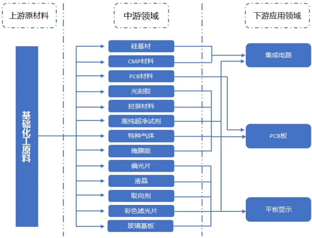 “十大領域用化工新材料發展研究”之 電子信息領域用化工新材料發展趨勢研究 霍正元 張皓瑋 齊景麗 化工新材料產業是支撐現代工業體系的物質基礎,其中電子信息領域用化工新材料是半導體、新能源等戰略性新興產業發展的關鍵支撐。這類材料的技術突破不僅直接關系到國家科技實力、經濟競爭力和國防安全,更已成為全球科技競爭的戰略制高點。在芯片制造、顯示面板、通信設備等高端電子產品的產業鏈中,光刻膠、高純電子氣體、半導體材料等關鍵材料的技術水平,不僅決定著電子信息產業的自主可控能力,更深刻影響著全球產業鏈格局的重構。當前,突破關鍵材料“卡脖子”技術、構建自主可控的材料體系,已成為實現產業高端化發展、保障產業鏈安全的戰略核心。 隨著新一代信息技術快速迭代,電子信息領域化工新材料(以下簡稱電子化學品)呈現出產品細分品種持續增加、質量標準不斷提升、對純度和痕量雜質控制要求日益嚴苛、產品附加值顯著提高的發展趨勢。在此背景下,強化我國電子化學品自主保障能力,加快實現關鍵品種國產替代,對國家安全、推動經濟高質量發展和促進產業升級具有多重戰略價值。 本研究立足我國電子化學品產業發展現狀,系統梳理重點細分領域核心品種,深入剖析產業發展面臨的瓶頸問題,提出提升核心技術競爭力、完善產業鏈協同機制的創新路徑,為提升產業國際競爭力提供決策參考。 一、發展電子化學品的戰略必要性 (一)構建戰略縱深保障產業安全,搶占未來科技制高點 實現電子化學品全面自主保障,關乎國家科技安全、產業重構和戰略新興產業發展。增強電子化學品產業競爭力,一是破解“卡脖子”困境,保障供應鏈安全自主可控。擺脫高端芯片制造、先進顯示等核心環節所需的光刻膠、電子特氣、高純濕電子化學品、CMP拋光材料等關鍵材料的進口依賴,是保障國家信息安全和國防安全的戰略生命線工程。二是支撐數字經濟發展,搶占科技革命制高點。5G/6G通信、人工智能、物聯網、云計算等數字時代基礎設施的功能升級,與高頻覆銅板樹脂、低介電常數聚酰亞胺、封裝塑封料等化工新材料的技術迭代緊密關聯。 (二)構建現代化產業體系,提升價值鏈核心競爭力 構建現代化產業體系,提升價值鏈核心競爭力,是我國實現從“制造大國”向“制造強國”躍遷的戰略支點。推進電子化學品產業升級,一是突破“微笑曲線”底端困境,向價值鏈上游攀升。推動國內半導體、顯示面板、消費電子等整機產業實現國產材料替代,是提升全產業鏈附加值和競爭力的關鍵。二是驅動“材料-器件-終端”全產業鏈協同升級。促進電子化學品生產研發與下游芯片制造、封裝測試等環節緊密協同,通過“材料先行”戰略可破解“不可用、不好用”的技術瓶頸,推進構建自主可控、安全高效、技術領先的現代化電子信息產業體系。 (三)打造原始創新策源地,構建學科融合創新范式 作為多學科交叉的戰略支點,電子化學品研發具有顯著的創新溢出效應。推動交叉學科創新研發,一是有助于催生前沿科學與技術的源頭創新。以材料研發帶動精密合成化學、高分子物理、界面科學、納米技術等基礎學科提升原始創新能力,有助于產生大量核心專利,形成技術壁壘。二是推動跨學科融合與創新范式變革。以電子化學品研發為切入點,示范AI應用和計算模擬篩選及設計,有助于形成“化工+電子+物理+數學”深度融合的研發范式,推動科研體系創新生態變革。 二、我國電子化學品產業現狀和發展趨勢 (一)電子化學品細分門類多,專業跨度大 電子化學品處于“基礎原料-功能材料-終端應用”的產業鏈核心環節。其上游為基礎化工原料,包括:烷烴及其派生物、烯烴及其衍生物、醌類物質、醛類物質、醇類物質、無機酸類物質、無機堿類物質、無機鹽類物質以及各式各樣的工業氣體等。下游應用于集成電路和分立器件、晶體硅太陽能、印制線路板、液晶顯示器件、光電子器件、移動通訊設備等電子元器件,零部件和整機生產與組裝,以及新能源電池等諸多領域。 電子化學品已形成超2萬余種細分品類的龐大體系,具有質量要求高、批次用量小、對環境潔凈度要求苛刻、產品更新換代快、資金投入量大、產品附加值較高等特點。典型的半導體用電子化學品為:光刻膠(又稱光致抗蝕劑)、濕電子化學品、電子特氣、封裝材料;FPD平板顯示(含TFT-LCD、CF、TP、OLED、PDP等)所需濾光片、偏光片、液晶、光學膜等,以及基板、印刷電路板(PCB)專用化學品。 光刻膠用于光刻工藝,是決定芯片電路精度的關鍵材料;濕電子化學品用于晶圓清洗、蝕刻等工序,直接影響芯片良率;電子特氣用于離子注入、薄膜沉積等工藝。 數據來源:根據公開資料整理。 圖1 半導體材料產品分類結構圖 表1 電子工業重點領域電子化學品品種 數據來源:根據公開資料整理。 (二)我國高端產品國產化進程持續快速推進 全球市場維持歐、美、日等國企業長期主導格局,在高端產品領域占據主導地位。2024年,全球電子化學品和材料市場規模約608億美元,預計到2037年將擴大至1313.5億美元,年復合增長率約6.1%。國內企業通過技術突破和國產替代,逐步提升市場份額,在濕電子化學品、電子特氣等領域,興福電子、華特氣體、中巨芯、彤程新材料、多氟多、中船派瑞等企業已具