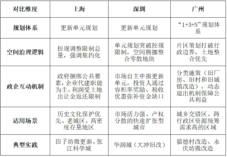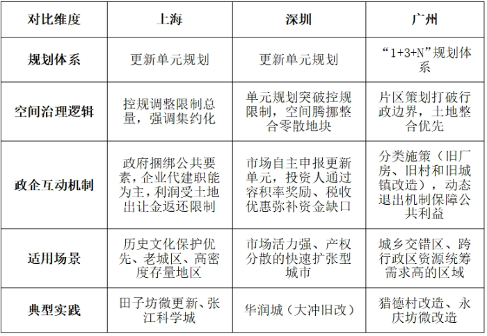 我國城市更新制度體系與經驗分析 ——以上海、深圳、廣州為例 石延杰 摘要:隨著我國城鎮(zhèn)化進程進入存量更新階段,城市更新成為破解空間資源約束、推動高質量發(fā)展的重要路徑。本文以國家政策框架為背景,選取上海、深圳、廣州為典型案例,系統(tǒng)梳理三地城市在制度體系、實施路徑與創(chuàng)新實踐上的更新經驗。研究發(fā)現,上海側重政府統(tǒng)籌下的剛性規(guī)劃與公共利益保障,深圳依托市場化政策工具,探索高強度開發(fā)與公共利益兼容機制,廣州則通過分類施策與多元主體利益協調機制破解復雜更新難題。研究建議,未來城市更新需立足城市稟賦優(yōu)化制度供給,通過健全法律體系、創(chuàng)新多元融資機制、深化公眾參與,實現空間治理現代化與經濟、社會、文化價值的協同提升。 關鍵詞:城市更新;政策體系;經驗分析 近年來,隨著我國城鎮(zhèn)化水平的提高,大量城市在經歷快速擴張后逐漸面臨空間資源緊張、基礎設施老化、生態(tài)環(huán)境惡化、文化遺產保護壓力增大等問題。在“增量建設”空間日趨飽和的背景下,如何通過城市更新對既有建成區(qū)進行功能重塑、空間優(yōu)化與人居環(huán)境提升,成為城市高質量發(fā)展的重要議題[1]。城市更新由此成為我國城市轉型升級過程中的關鍵抓手,既要滿足城市經濟再增長的需求,也要兼顧文化和環(huán)境的多重價值。 一、現階段我國城市更新政策體系及特點 為引導各地因地制宜地實施城市更新,國家相關部門先后出臺了多項指導性文件,對城市更新的總體原則、實施路徑、管理機制等做出了明確規(guī)定。 (一)政策體系 從國家層面政策演進脈絡來看,當前城市更新制度體系主要圍繞戰(zhàn)略定位、制度約束、規(guī)劃統(tǒng)籌與保障機制四個維度展開系統(tǒng)性建構。戰(zhàn)略導向層以《中華人民共和國國民經濟和社會發(fā)展第十四個五年規(guī)劃和2035年遠景目標綱要》為核心,明確將城市更新納入國家治理現代化范疇。制度約束層包含三大核心規(guī)范:住房和城鄉(xiāng)建設部《關于在實施城市更新行動中防止大拆大建問題的通知》(建科〔2021〕63號)設定拆除建筑面積比例≤20%、就地安置率≥50%等量化指標;國務院辦公廳《關于全面推進城鎮(zhèn)老舊小區(qū)改造工作的指導意見》(國辦發(fā)〔2020〕23號)建立基礎類、完善類、提升類三級改造標準;中共中央辦公廳、國務院辦公廳《關于在城鄉(xiāng)建設中加強歷史文化保護傳承的意見》明確在城市更新中進行嚴格拆除管理,禁止大拆大建。規(guī)劃統(tǒng)籌層通過自然資源部《關于開展低效用地再開發(fā)試點工作的通知》(自然資發(fā)〔2023〕171號)建立土地混合開發(fā)、容積率獎勵等存量用地政策;住房和城鄉(xiāng)建設部《關于扎實有序推進城市更新工作的通知》(建科〔2023〕30號)構建“專項規(guī)劃編制-年度行動計劃-項目庫管理”實施體系。保障機制層包含國務院辦公廳《關于進一步盤活存量資產擴大有效投資的意見》(國辦發(fā)〔2022〕19號)通過吸引社會資本參與盤活城市老舊資產資源,特別是老舊小區(qū)改造等;財政部印發(fā)《中央財政城鎮(zhèn)保障性安居工程專項資金管理辦法》(財綜〔2024〕2號)將老舊小區(qū)改造納入補助資金支持范疇;國家發(fā)展改革委、住房城鄉(xiāng)建設部《關于加強城鎮(zhèn)老舊小區(qū)改造配套設施建設的通知》(發(fā)改投資〔2021〕1275號)明確中央預算內投資將用于城鎮(zhèn)老舊小區(qū)改造配套設施建設項目。本體系通過戰(zhàn)略層定調、制度層劃界、規(guī)劃層操作、保障層托底的政策協同,推動城市更新從“項目驅動”向“制度驅動”轉型,體現了空間治理現代化的制度創(chuàng)新邏輯。 (二)政策特點 從這些政策演進脈絡可概括出以下幾個主要特點: 一是強調規(guī)劃先行與法制保障。城市更新項目往往牽涉空間結構重塑、土地用途調整、利益平衡等復雜問題,需要在法規(guī)層面提供穩(wěn)固的制度支撐,以保證更新項目的合規(guī)性和可持續(xù)性[2]。為此,國務院辦公廳發(fā)布《關于全面推進城鎮(zhèn)老舊小區(qū)改造工作的指導意見》(國辦發(fā)〔2020〕23號),以分類施策為基礎(分為基礎類、完善類、提升類改造),構建政府、居民、社會資本多方共擔的資金機制,統(tǒng)籌推進民生改善、經濟轉型與內需擴張,并注重長效管理與社會治理創(chuàng)新,強調居民參與和歷史文化保護;自然資源部發(fā)布《支持城市更新的規(guī)劃與土地政策指引(2023版)》(自然資辦發(fā)〔2023〕47號),要求將城市更新納入國土空間規(guī)劃體系,通過總體規(guī)劃明確更新目標、實施策略,并在詳細規(guī)劃中細化更新單元的功能定位,強調規(guī)劃剛性約束。 二是倡導多元化投融資機制。城市更新具有投入資金量大、回報周期長的特點,僅依靠政府財政難以持續(xù),需要更多社會資本的參與。住建部發(fā)布《關于開展第一批城市更新試點工作的通知》(建辦科函〔2021〕443號),提出推動試點城市探索市場化運作機制,鼓勵金融機構參與,完善資金平衡機制;自然資源部印發(fā)《支持城市更新的規(guī)劃與土地政策指引(2023版)》(自然資辦發(fā)〔2023〕47號),提出優(yōu)化土地配置方式,允許功能混合利用和協議出讓,