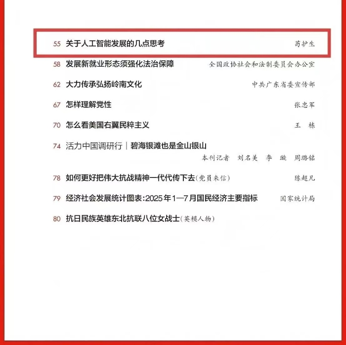 編者按:9月1日出版的2025年第17期《求是》雜志刊發(fā)公司黨委書記、董事長(zhǎng)茍護(hù)生同志理論文章《關(guān)于人工智能發(fā)展的幾點(diǎn)思考》,文章立足全球人工智能發(fā)展浪潮,緊扣我國(guó)人工智能產(chǎn)業(yè)實(shí)際,以辯證思維深入剖析創(chuàng)新與開放、發(fā)展與安全、政府與市場(chǎng)、應(yīng)用與治理的內(nèi)在邏輯關(guān)系,在搶抓人工智能發(fā)展機(jī)遇、直面技術(shù)應(yīng)用風(fēng)險(xiǎn)挑戰(zhàn)中,為推動(dòng)人工智能與經(jīng)濟(jì)社會(huì)深度融合、助力我國(guó)搶占全球科技競(jìng)爭(zhēng)主動(dòng)權(quán)提供了有益借鑒。現(xiàn)予以轉(zhuǎn)載,供學(xué)習(xí)參考。 關(guān)于人工智能發(fā)展的幾點(diǎn)思考 茍護(hù)生 近年來,以大模型為代表的人工智能迎來新的發(fā)展浪潮,正以前所未有的速度深入滲透經(jīng)濟(jì)社會(huì)發(fā)展的方方面面,貼近每個(gè)人的生活和工作,深刻重構(gòu)著人類社會(huì)生產(chǎn)力和文明形態(tài)。習(xí)近平總書記指出,人工智能是新一輪科技革命和產(chǎn)業(yè)變革的重要驅(qū)動(dòng)力量,將對(duì)全球經(jīng)濟(jì)社會(huì)發(fā)展和人類文明進(jìn)步產(chǎn)生深遠(yuǎn)影響。當(dāng)前,全球主要國(guó)家都在搶抓人工智能發(fā)展機(jī)遇。近日,國(guó)務(wù)院印發(fā)《關(guān)于深入實(shí)施“人工智能+”行動(dòng)的意見》,明確實(shí)施“人工智能+”行動(dòng)的總體要求、發(fā)展目標(biāo)和重點(diǎn)方向,為進(jìn)一步推動(dòng)人工智能與經(jīng)濟(jì)社會(huì)各行業(yè)各領(lǐng)域廣泛深度融合提供了方向指引。我們要深刻領(lǐng)會(huì)習(xí)近平總書記關(guān)于人工智能的重要論述,把握好創(chuàng)新與開放、發(fā)展與安全、政府與市場(chǎng)、應(yīng)用與治理的辯證關(guān)系,立足產(chǎn)業(yè)發(fā)展需求,順應(yīng)治理變革趨勢(shì),走出一條具有中國(guó)特色的人工智能發(fā)展之路。 自主創(chuàng)新與開放合作的辯證統(tǒng)一。習(xí)近平總書記強(qiáng)調(diào),“自主創(chuàng)新是開放環(huán)境下的創(chuàng)新”。這一重要論斷為處理好人工智能技術(shù)自主與全球化協(xié)作提供了根本遵循。 自主創(chuàng)新是人工智能發(fā)展的“根”,沒有核心技術(shù)的自主化,開放合作就可能淪為“依附式發(fā)展”,在關(guān)鍵領(lǐng)域受制于人。2018年以來,面對(duì)美國(guó)對(duì)人工智能和芯片等高技術(shù)產(chǎn)業(yè)的嚴(yán)密封鎖和瘋狂打壓,我國(guó)始終堅(jiān)持自主創(chuàng)新,在芯片結(jié)構(gòu)、核心算法等底層技術(shù)領(lǐng)域?qū)崿F(xiàn)突破,初步構(gòu)建了自主化的產(chǎn)業(yè)生態(tài)。例如,深度求索公司通過自主優(yōu)化算法架構(gòu),用遠(yuǎn)低于國(guó)際同類產(chǎn)品的成本,達(dá)到了相近的性能水平。再如,我國(guó)企業(yè)在激光雷達(dá)、高精度地圖等關(guān)鍵環(huán)節(jié)的自主創(chuàng)新,讓我國(guó)躋身自動(dòng)駕駛領(lǐng)域領(lǐng)先國(guó)家。這些技術(shù)的突破離不開我國(guó)良好的自主創(chuàng)新條件。國(guó)內(nèi)超大規(guī)模市場(chǎng)是人工智能技術(shù)落地與迭代的“試驗(yàn)場(chǎng)”,我國(guó)擁有全球最大的數(shù)字經(jīng)濟(jì)市場(chǎng),為人工智能應(yīng)用提供了豐富場(chǎng)景;國(guó)內(nèi)完整的產(chǎn)業(yè)鏈體系,為人工智能技術(shù)的自主發(fā)展提供了有效支撐。 自主創(chuàng)新并非“閉門造車”,堅(jiān)持開放合作才能緊跟科技發(fā)展方向,避免裹足不前或淪為“技術(shù)孤島”。在基礎(chǔ)研究領(lǐng)域,全球開源社區(qū)貢獻(xiàn)的TensorFlow、PyTorch等深度學(xué)習(xí)框架,為我國(guó)人工智能創(chuàng)新提供了底層支撐,我國(guó)也依靠大模型的開源生態(tài),打破了美國(guó)科技巨頭的封閉系統(tǒng)壟斷,為全球人工智能發(fā)展提供了中國(guó)解決方案。在高端人才方面,全球頂尖人工智能研究者分布具有分散性,需要通過國(guó)際交流集聚智慧。人工智能治理是全球性的挑戰(zhàn),需要各國(guó)攜手共進(jìn)。在大國(guó)科技博弈加劇的背景下,國(guó)際人工智能治理呈現(xiàn)多極化競(jìng)爭(zhēng)與碎片化合作并存、技術(shù)標(biāo)準(zhǔn)爭(zhēng)奪與倫理價(jià)值博弈交織的復(fù)雜態(tài)勢(shì)。美國(guó)利用技術(shù)霸權(quán)塑造全球人工智能領(lǐng)導(dǎo)力,歐盟以立法監(jiān)管為導(dǎo)向鞏固在人工智能全球治理中的領(lǐng)導(dǎo)地位,我國(guó)則堅(jiān)持以開放合作的姿態(tài),主張通過“技術(shù)共享、能力共建”縮小數(shù)字鴻溝,并通過世界人工智能大會(huì)等國(guó)際平臺(tái)提出人工智能治理方略,為全球人工智能治理提供有益參考。 7月26日至28日,2025世界人工智能大會(huì)暨人工智能全球治理高級(jí)別會(huì)議在上海舉辦。“智能時(shí)代 同球共濟(jì)”的主題貫穿始終,為全球人工智能領(lǐng)域帶來一場(chǎng)思想與創(chuàng)新碰撞的盛宴。圖為參觀者在中國(guó)南方電網(wǎng)展區(qū)拍攝“悟空”帶電作業(yè)機(jī)器人。 新華社記者 陳浩明/攝 實(shí)踐表明,自主創(chuàng)新是開放合作的根基,開放合作是自主創(chuàng)新的助力,