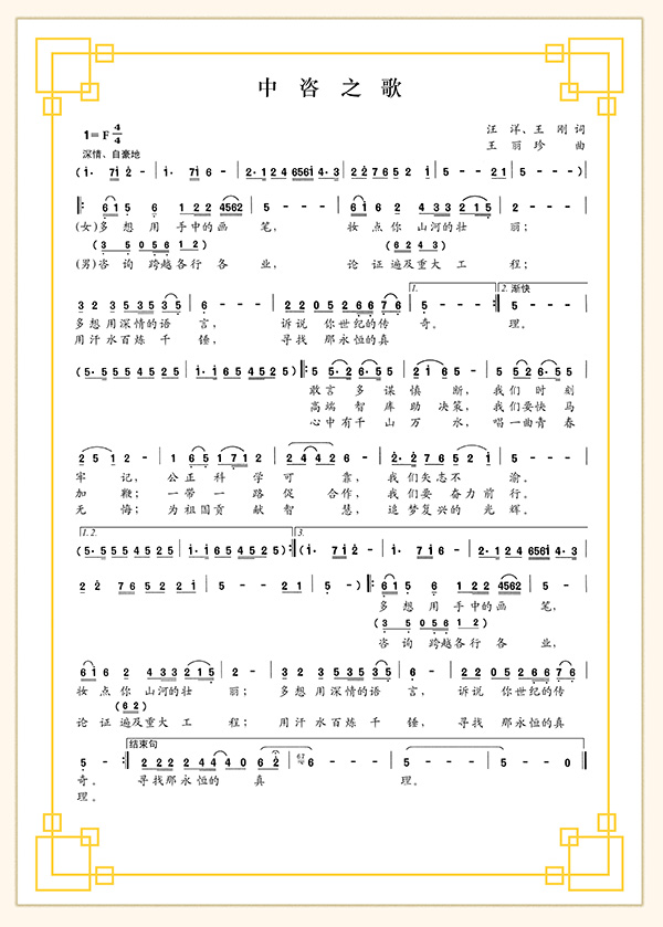 《中咨之歌》旋律優(yōu)美、抒情大氣,易上口傳唱,歌詞凝煉了公司服務(wù)國家、貢獻(xiàn)社會的歷史傳承,凸顯了新時期高端智庫建設(shè)的宗旨目標(biāo),展現(xiàn)了中咨人志存高遠(yuǎn)、矢志不渝、開拓創(chuàng)新、追夢筑夢的精神風(fēng)貌。曾獲得中國職工音樂家協(xié)會和國資委新聞中心聯(lián)合舉辦的2016中國職工好歌曲創(chuàng)作征集評選活動“優(yōu)秀創(chuàng)作歌曲”表彰,并在權(quán)威雜志《歌曲》刊發(fā),中國曲譜網(wǎng)選登發(fā)表。